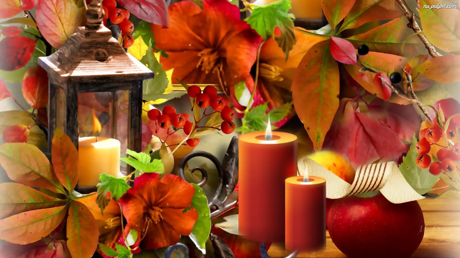 Jabłko, Lampion, Jarzębina, Liście, Świece, Kompozycja, Kwiaty