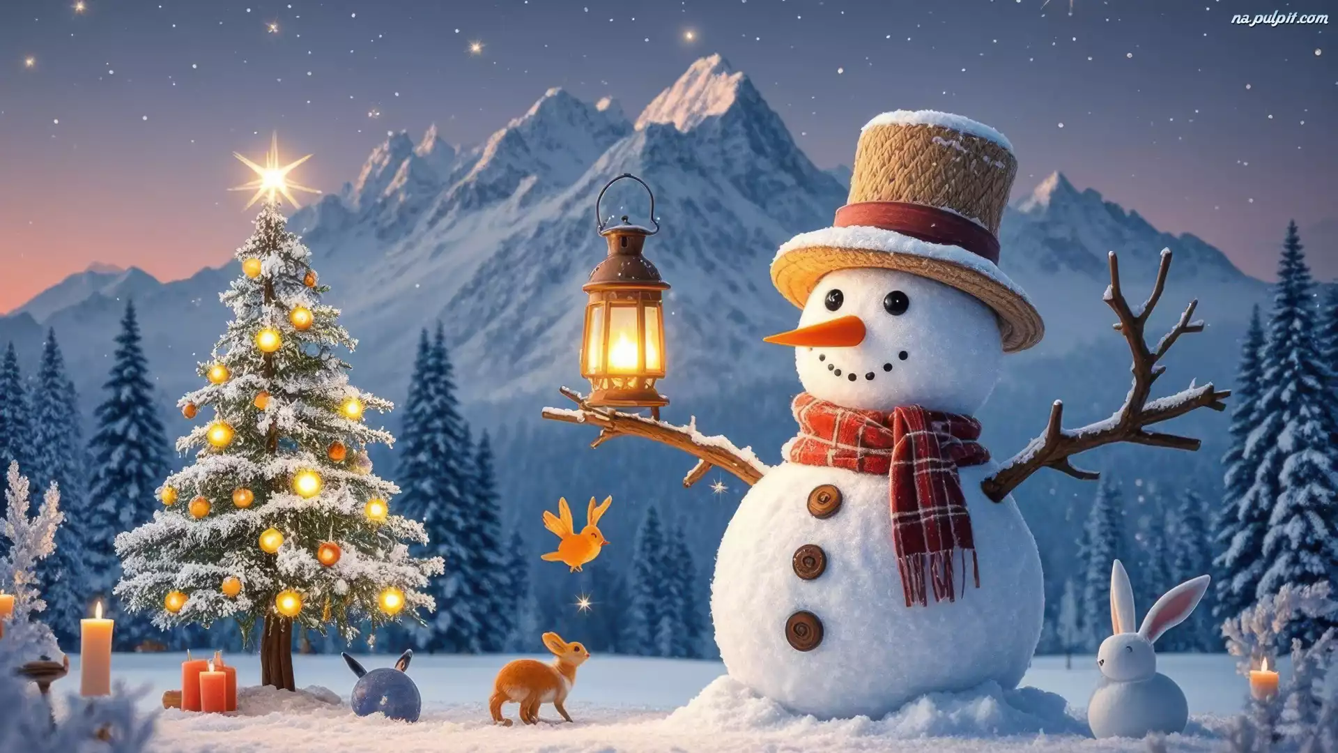 Góry, Boże Narodzenie, Lampion, Choinka, Bałwanek, Zima Na Pulpit