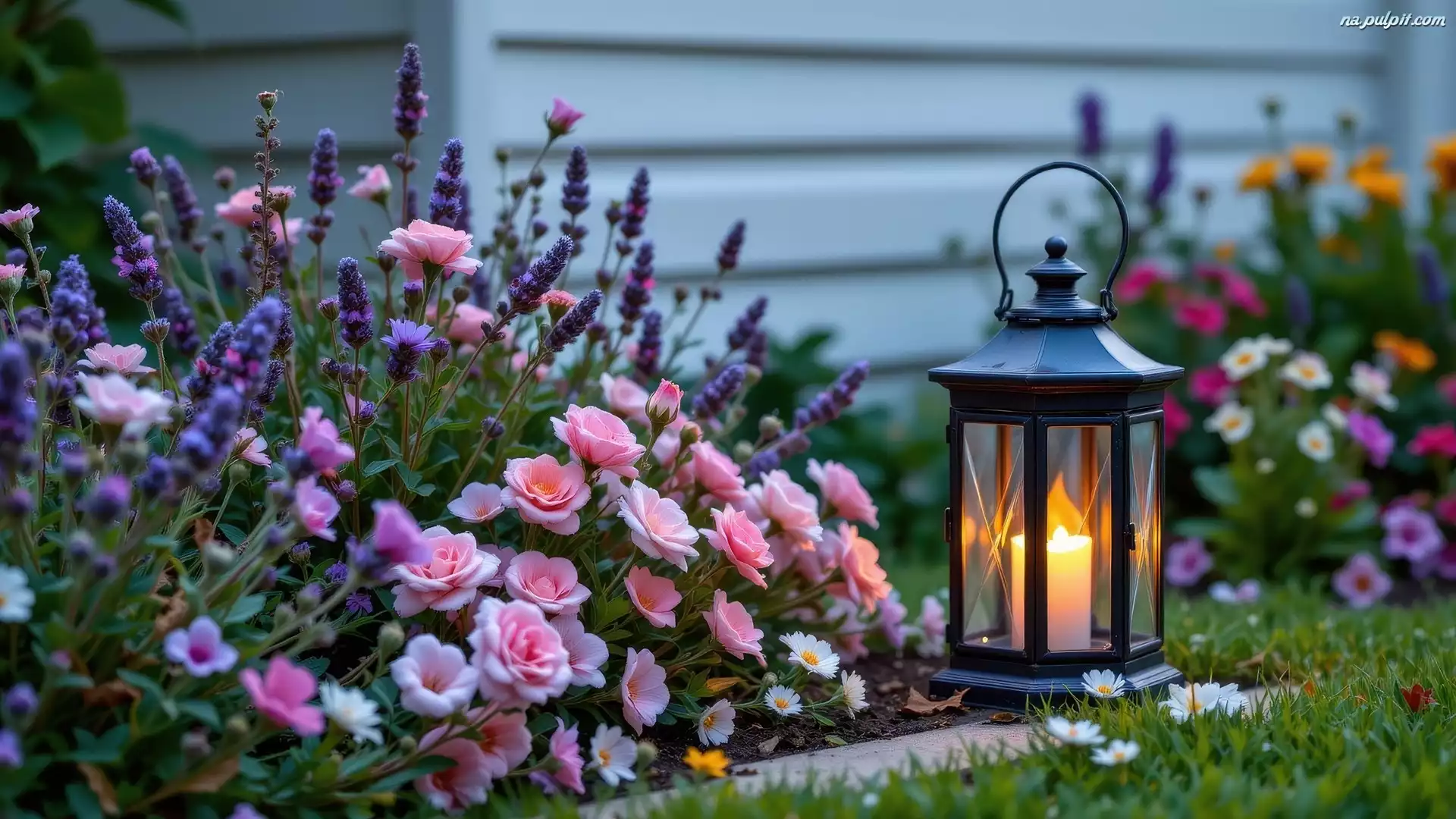 Fioletowe, Lampion, Świeca, Kwiaty, Różowe Na Pulpit
