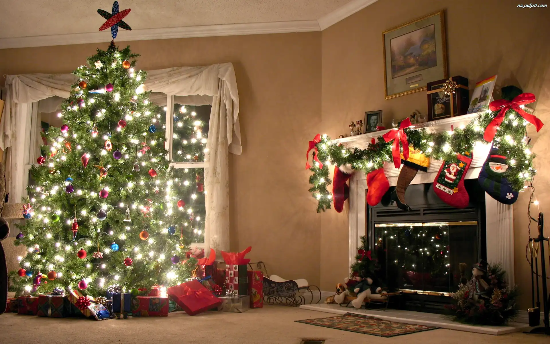 Lampki, Prezenty, Kominek, Choinka, Skarpety