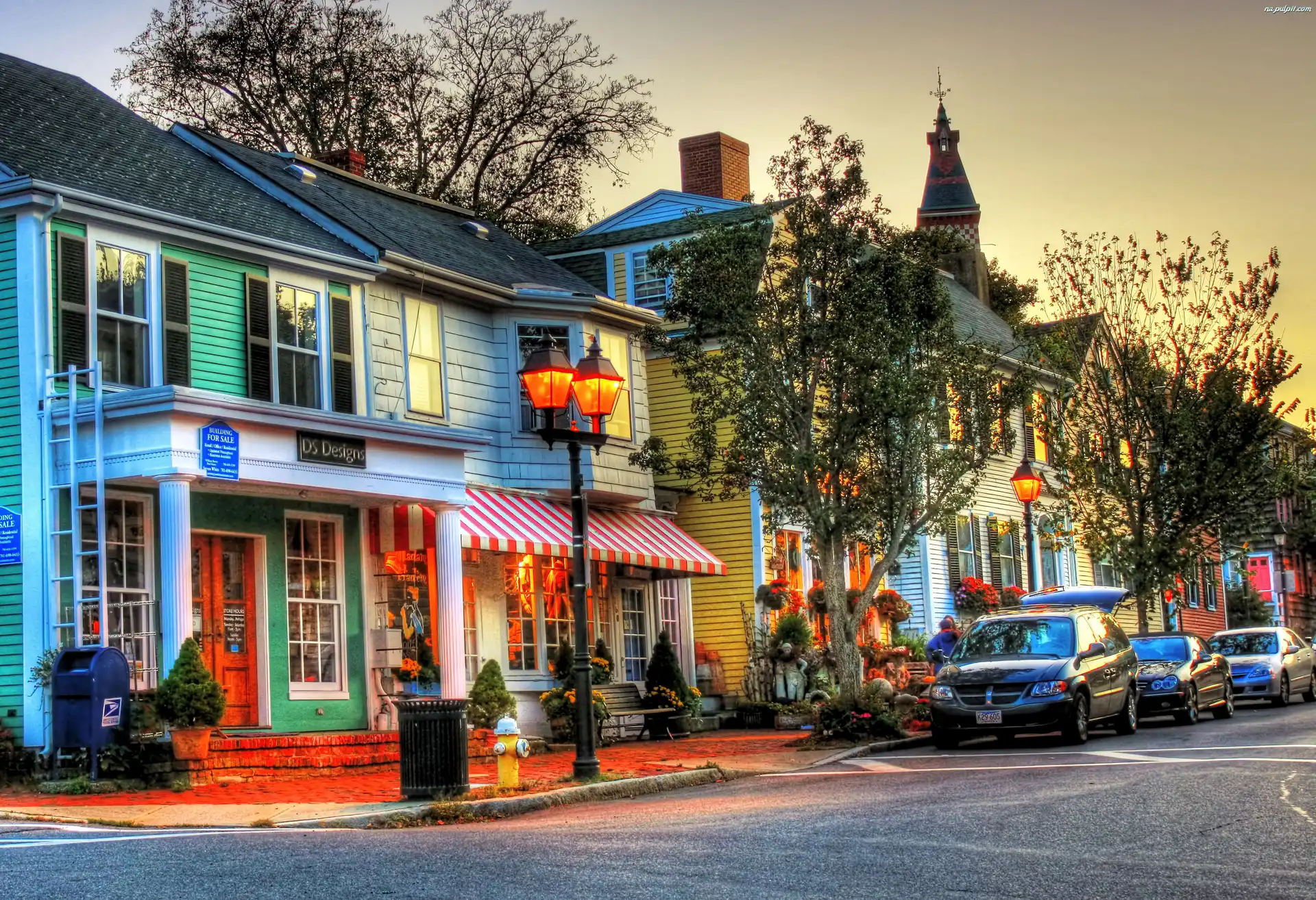 Lampy, Samochody, Domy, Ulica, Drzewa