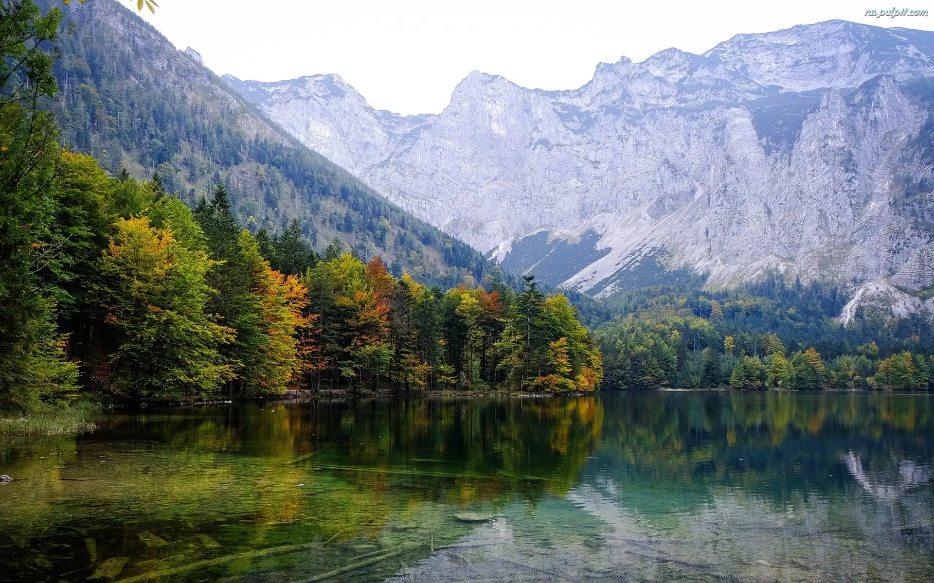 Odbicie, Gmina Ebensee, Drzewa, Góry, Jesień, Austria, Jezioro Hinterer Langbathsee Na Pulpit