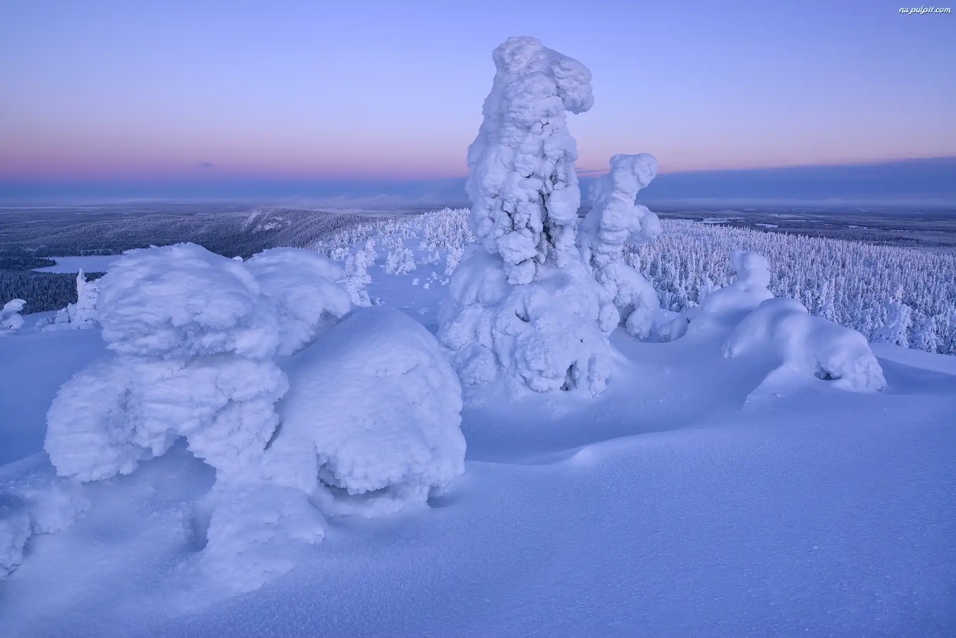 Zaśnieżone, Laponia, Finlandia, Drzewa, Zima, Rezerwat Valtavaara