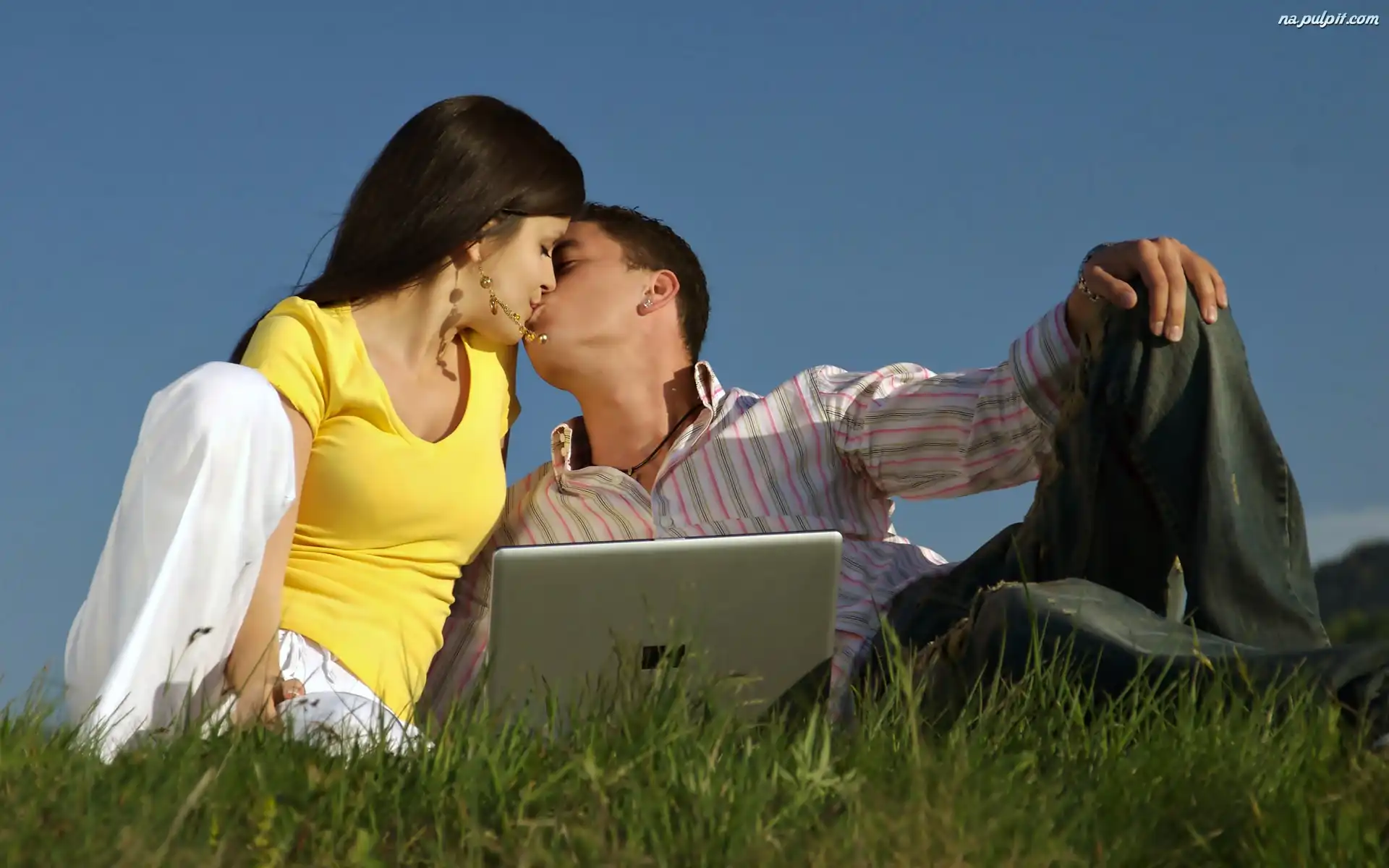 Laptop, Chłopak, Dziewczyna, Pocałunek Na Pulpit