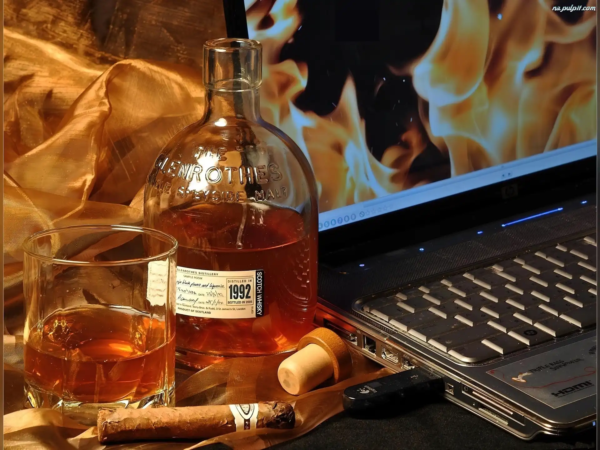 Laptop, Koniak, Butelka, Szklaneczka, Cygaro Na Pulpit