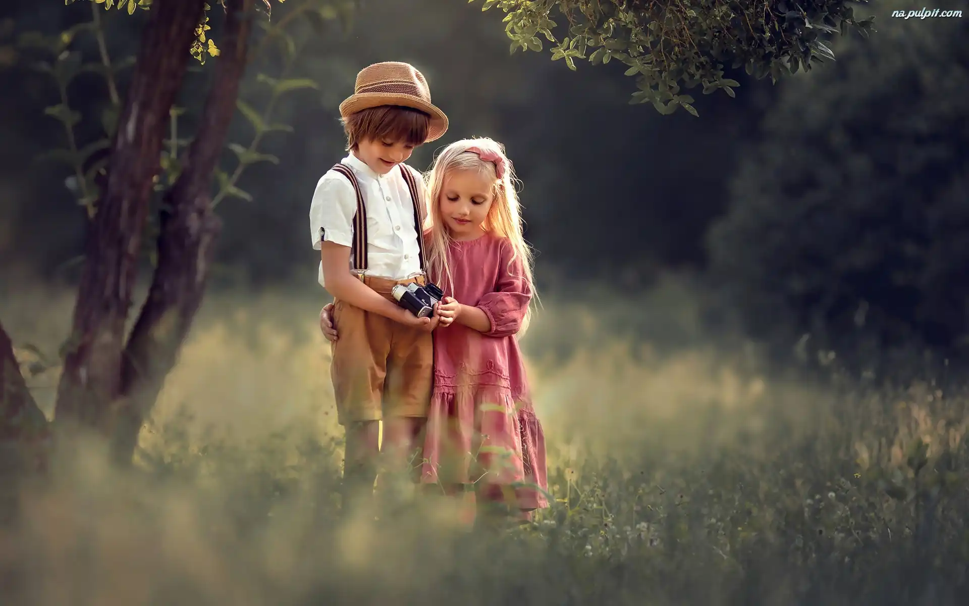 Las, Dzieci, Chłopiec, Dziewczynka, Aparat fotograficzny Na Pulpit