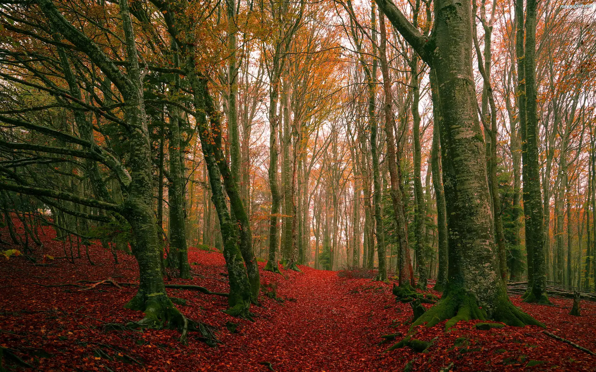 Opadłe, Las, Drzewa, Liście, Ścieżka, Gałęzie, Jesień, Czerwone