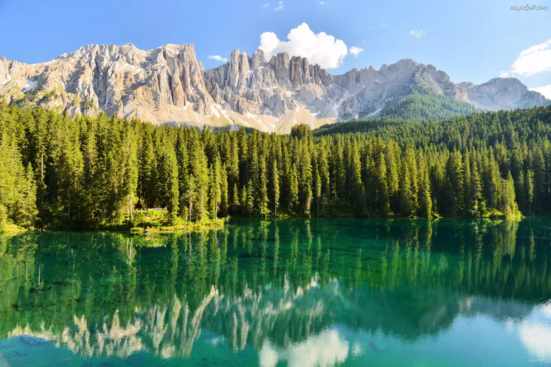 Dolomity, Las, Odbicie, Góry, Włochy, Jezioro Karersee Na Pulpit