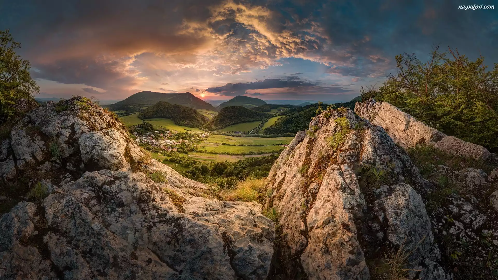 Skały, Góry, Domy Las, Drzewa, Dolina, Chmury Na Pulpit