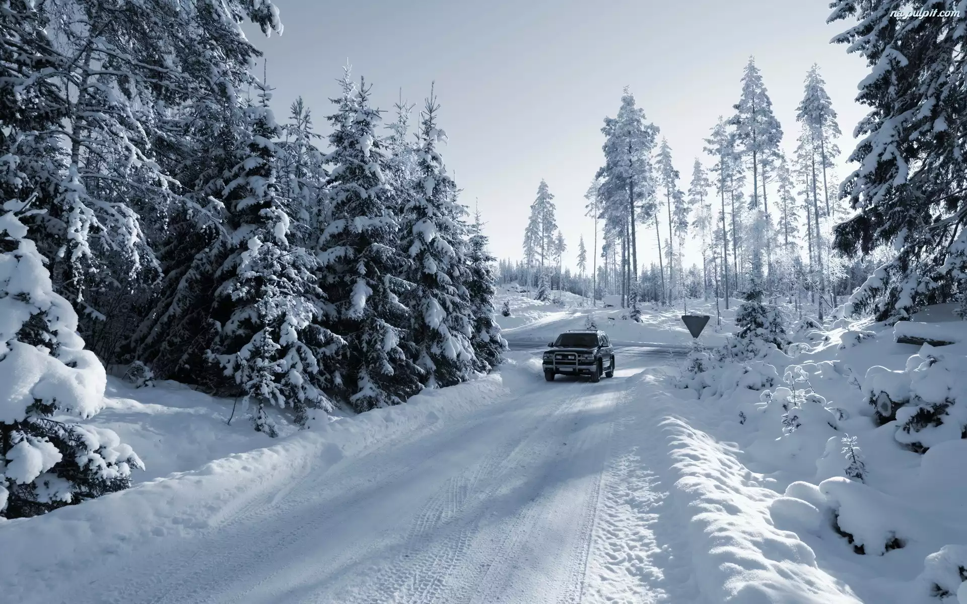 Las, Ośnieżone, Auto, Droga, Drzewa Na Pulpit