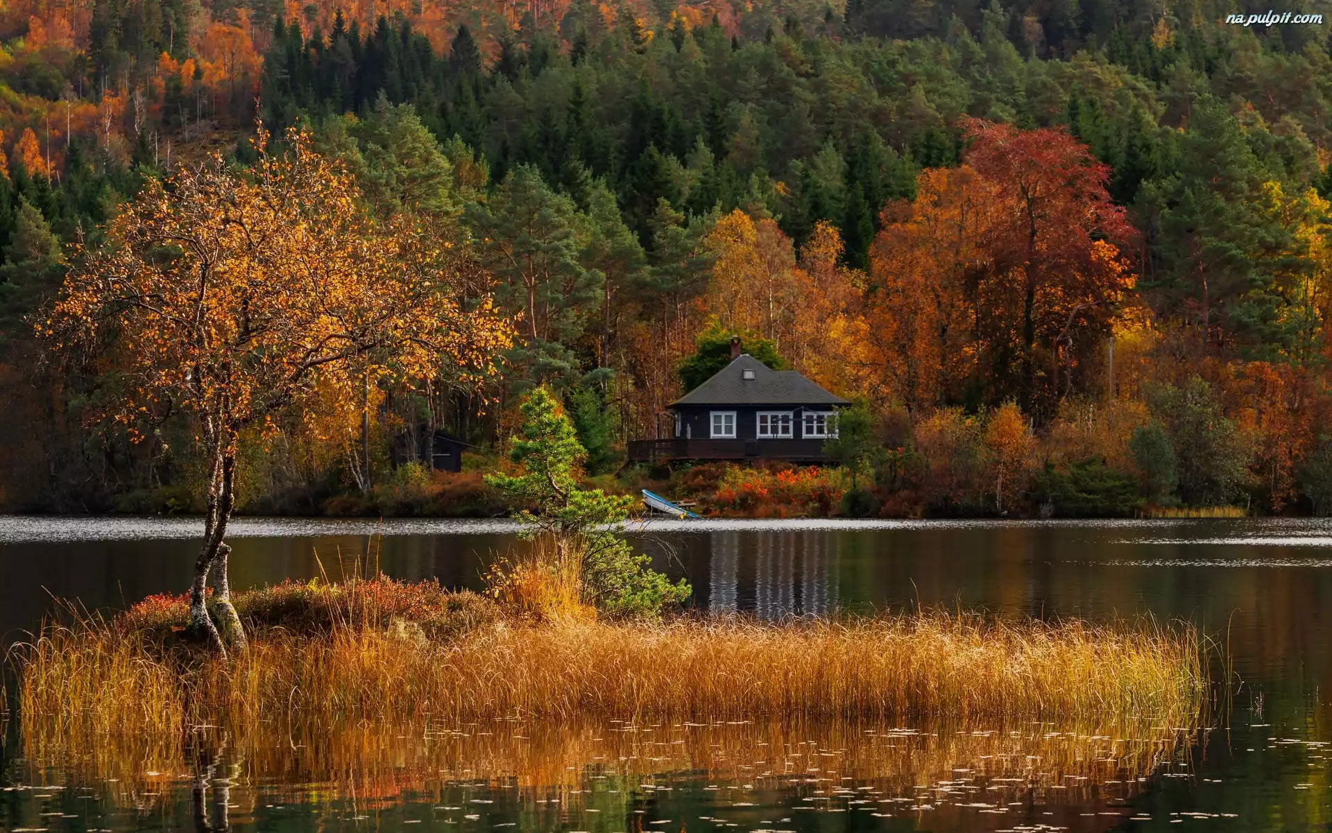 Jezioro, Las, Drzewa, Dom, Jesień Na Pulpit