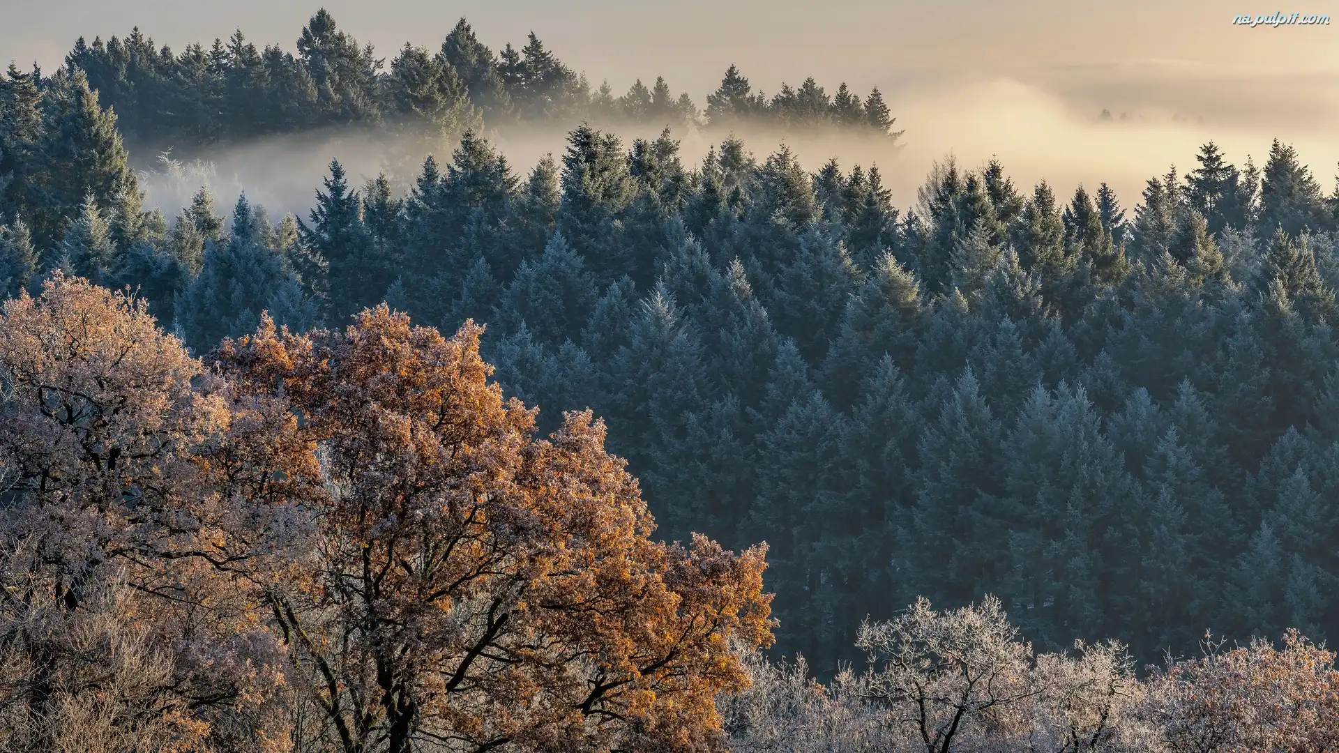 Iglaste, Las, Drzewa, Mgła, Liściaste