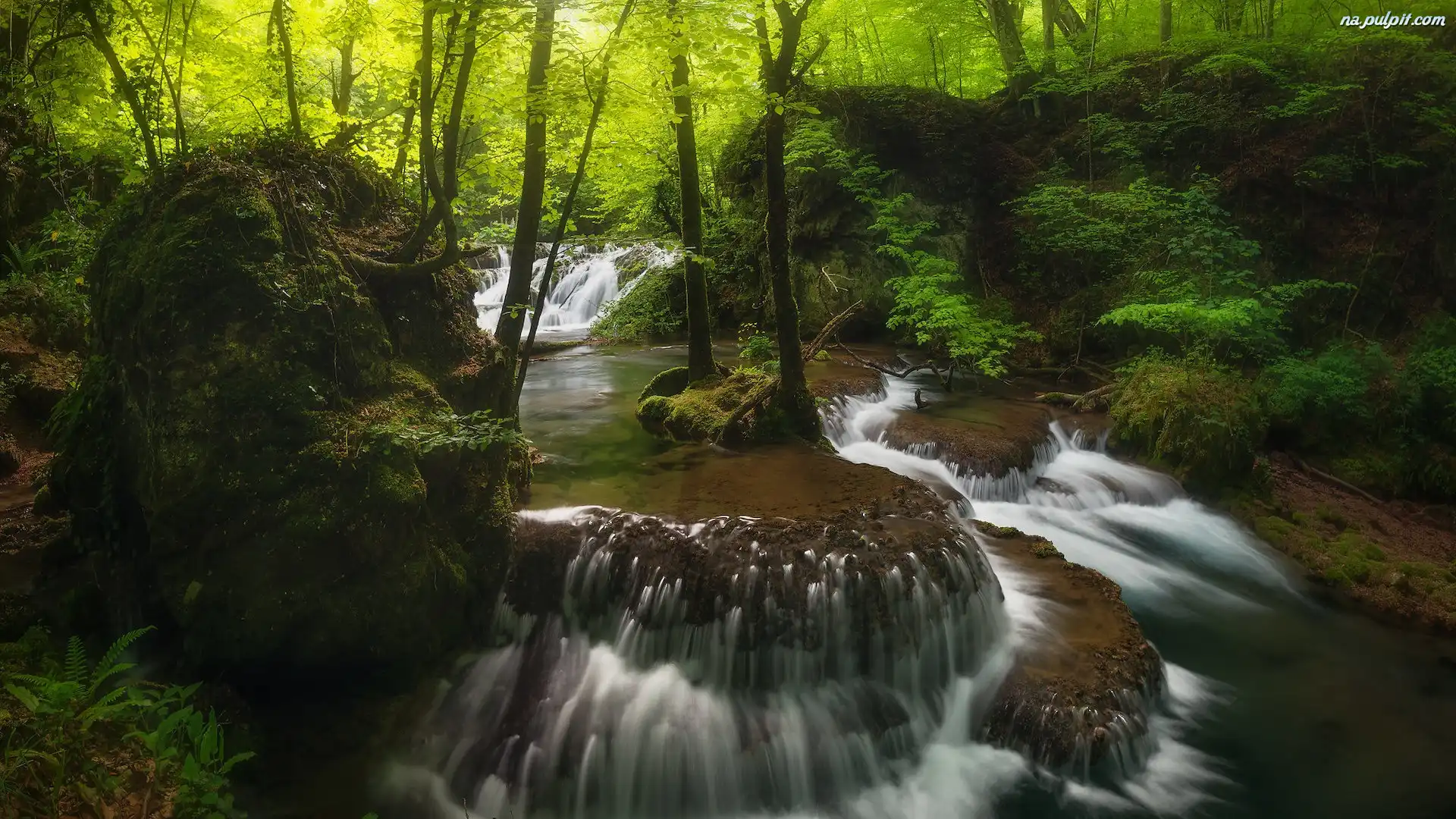 Kaskada, Las, Drzewa, Paprocie, Rzeka Na Pulpit