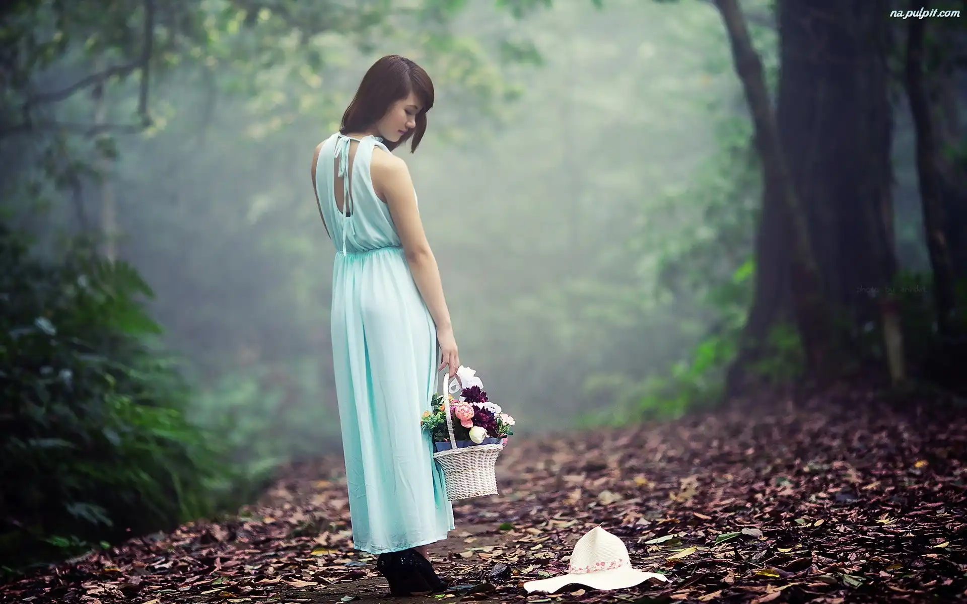 Las, Koszyk, Kwiaty, Liście, Dziewczyna, Mgła Na Pulpit