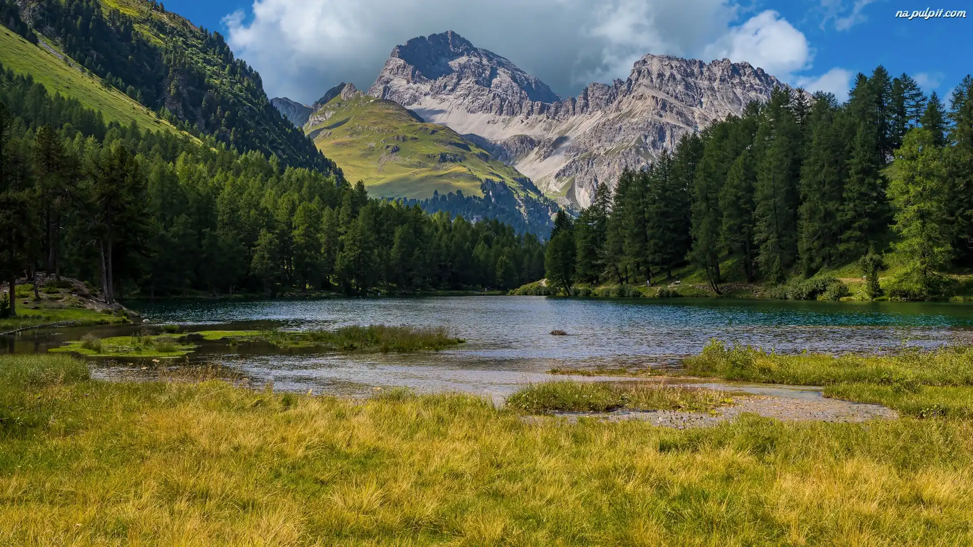 Las, Trawa, Chmury, Drzewa, Góry, Jezioro Na Pulpit