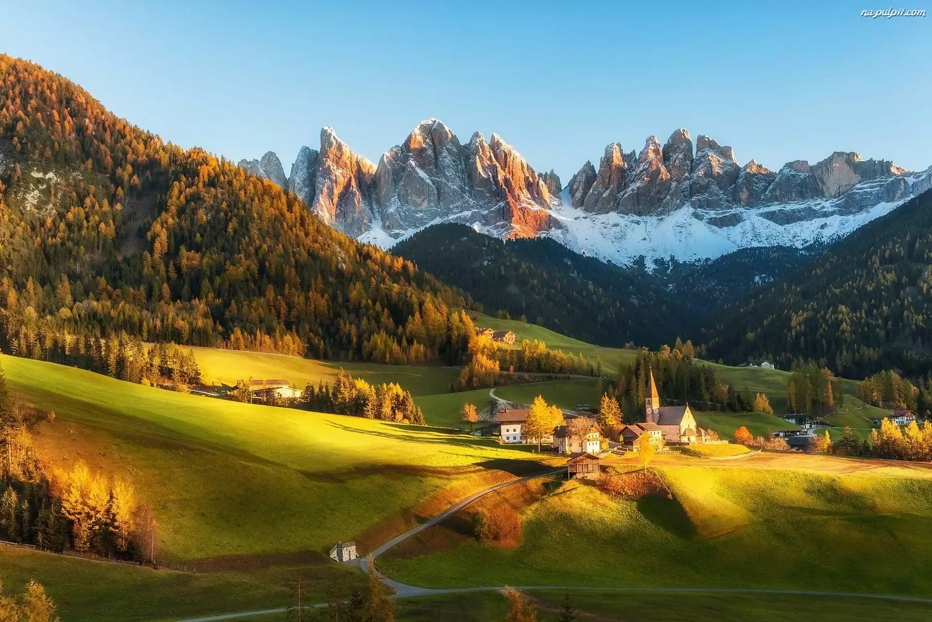 Las, Domy, Droga, Kościół, Góry, Śnieg Na Pulpit