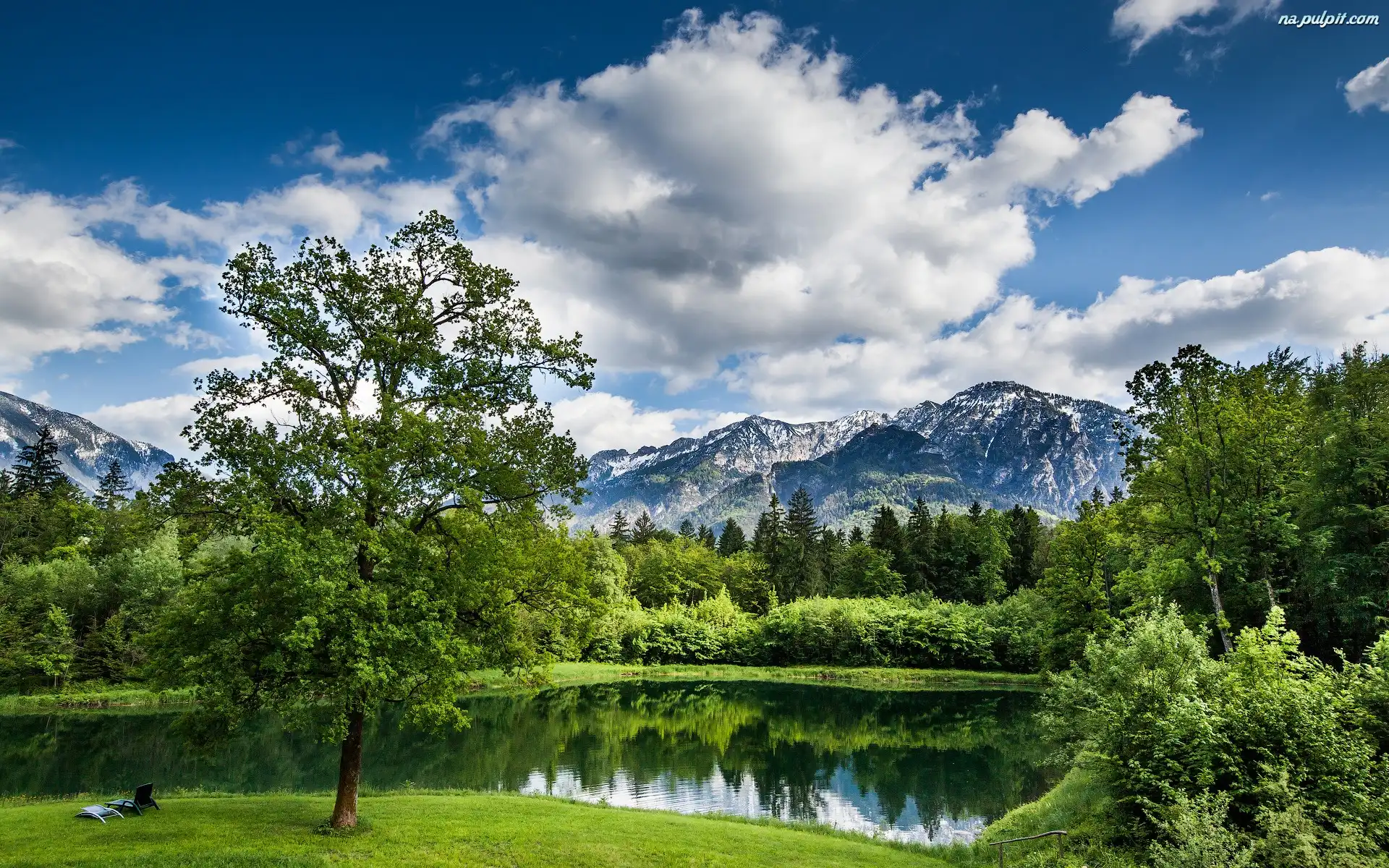Las, Łąka, Drzewa, Jezioro, Góry, Obłoki Na Pulpit