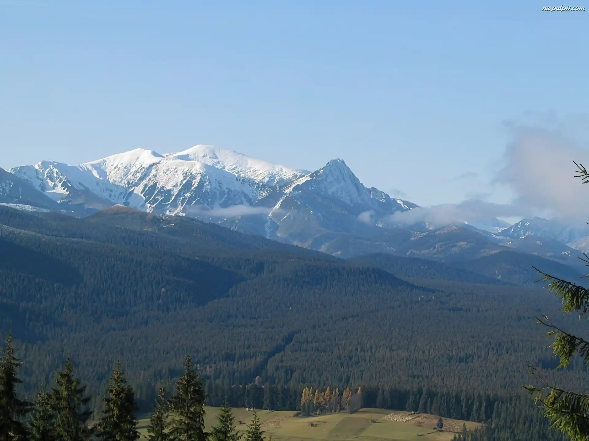 Las, Niebo, śnieg, Drzewo, Góry, Chmura Na Pulpit