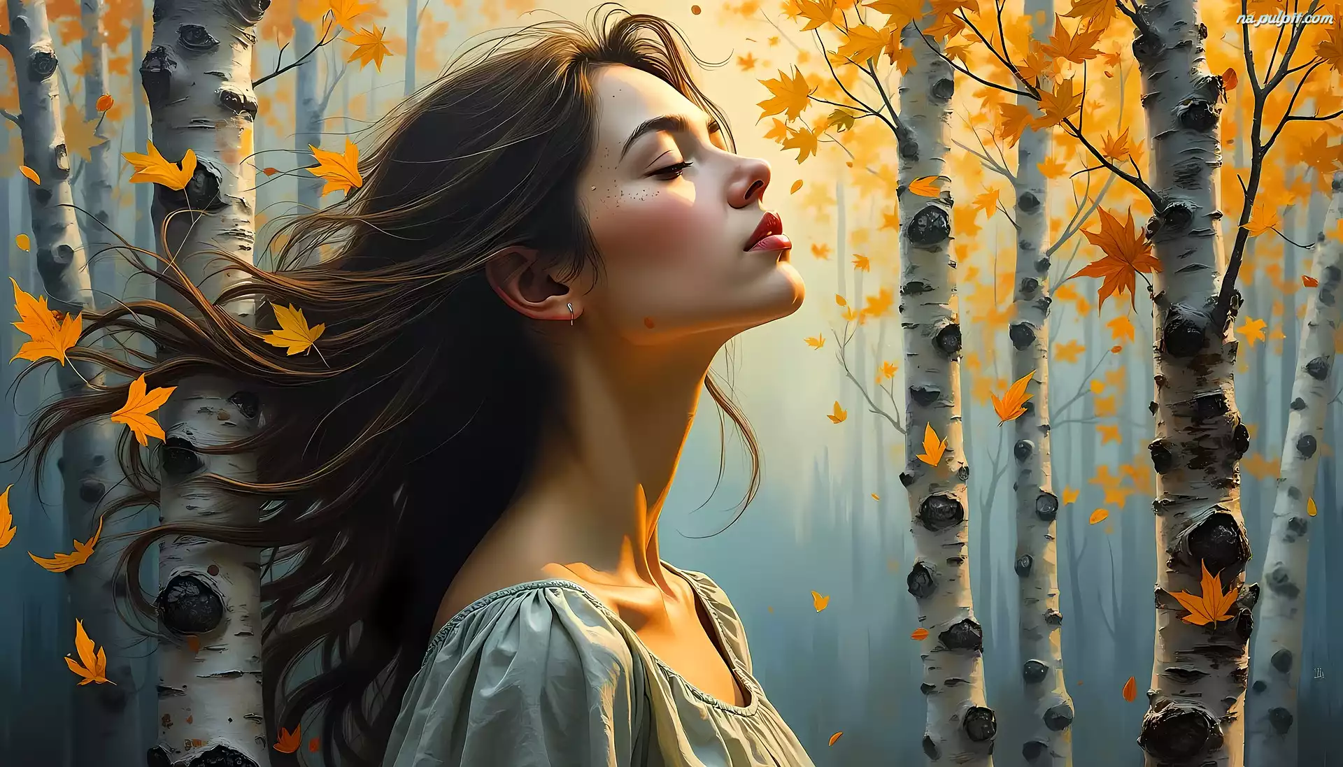Mgła, Jesień, Brzozy, Las, Kobieta, Grafika Na Pulpit
