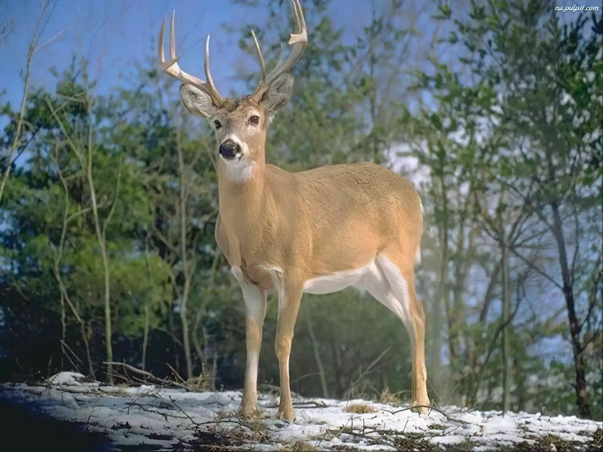 Las, Śnieg, Poroże, Jeleń, Drzewa Na Pulpit