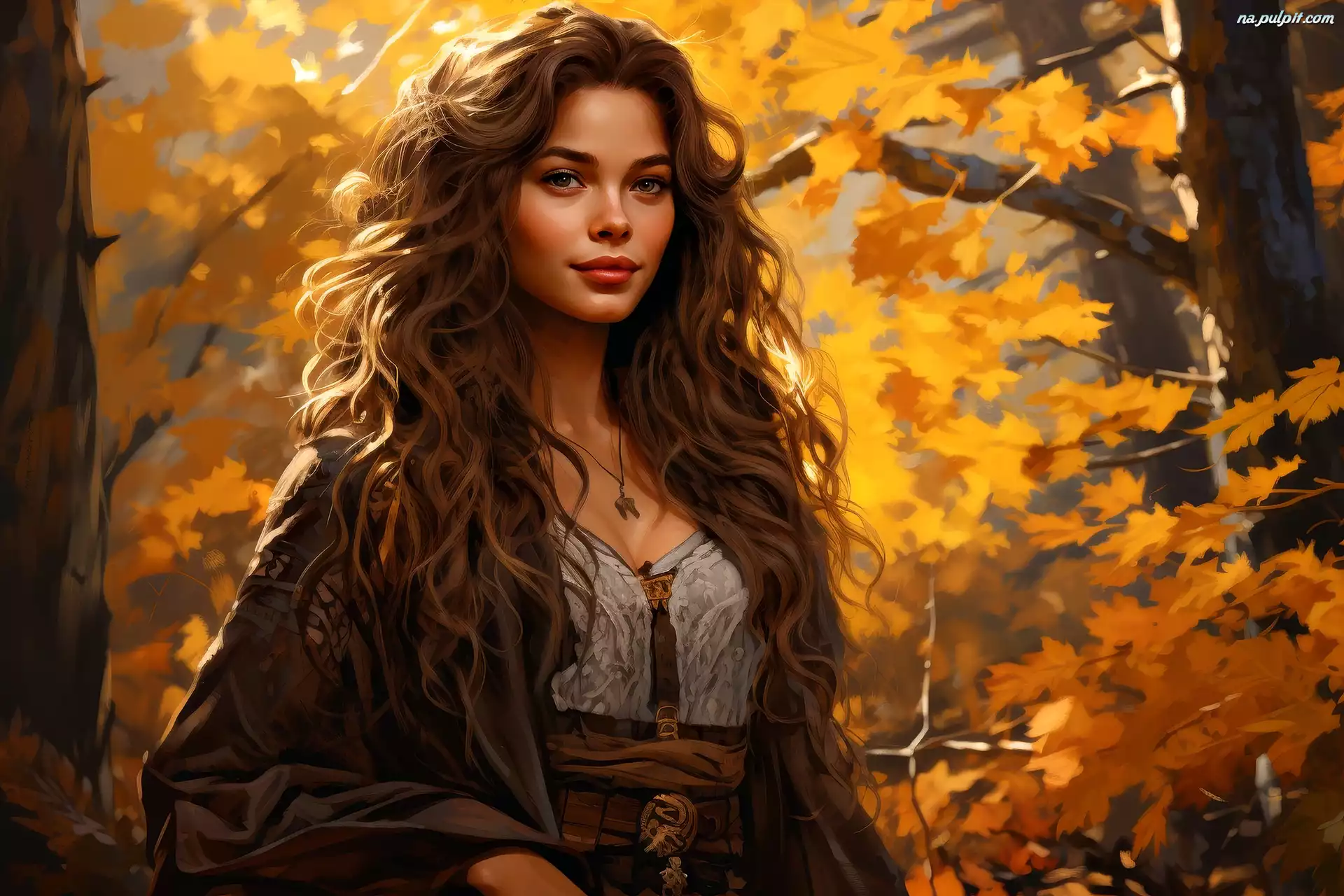 Grafika AI, Jesień, Włosy, Młoda, Kobieta, Kręcone, Las Na Pulpit