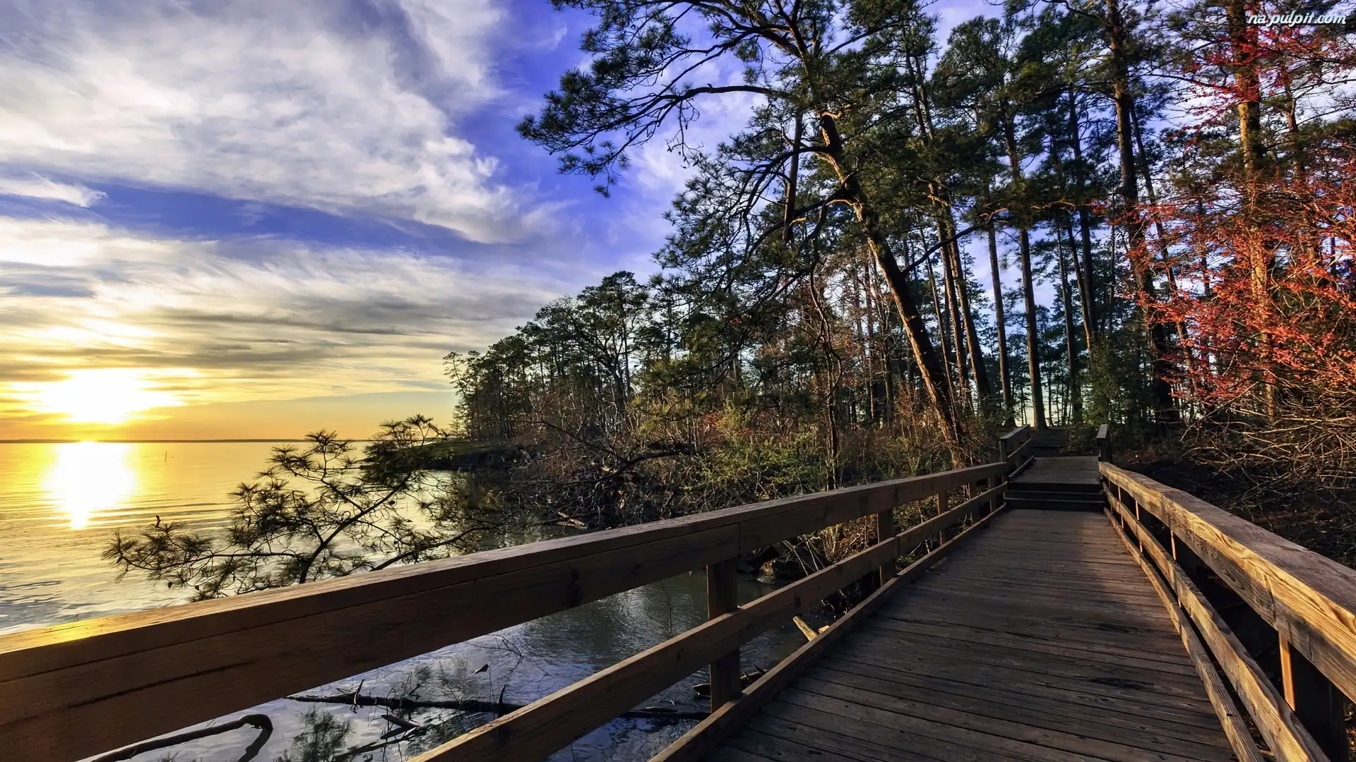 Las, Drewniany, Most, Wschód, Jezioro, Słońca Na Pulpit