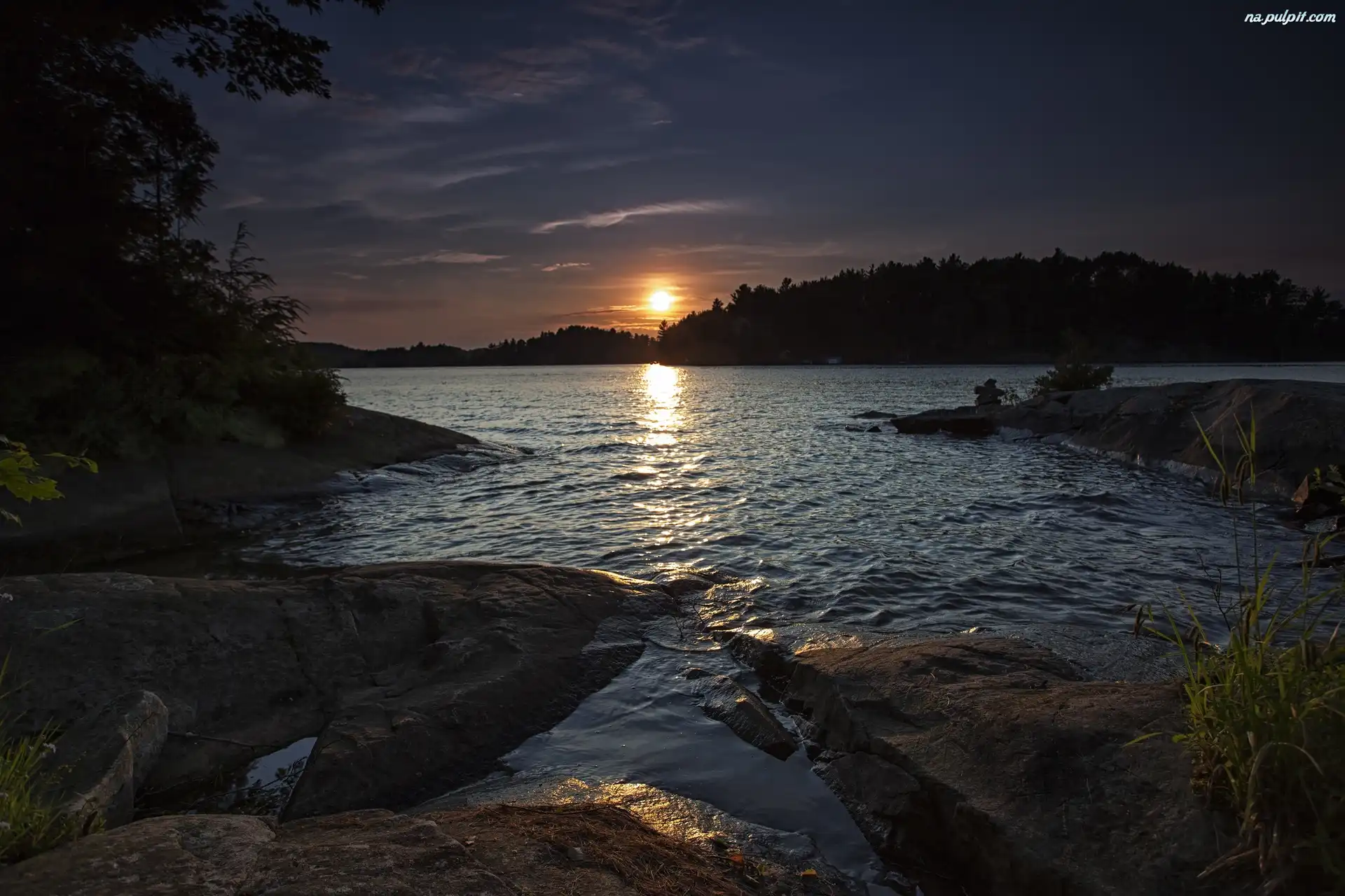 Świt, Jezioro, Las, Skałki