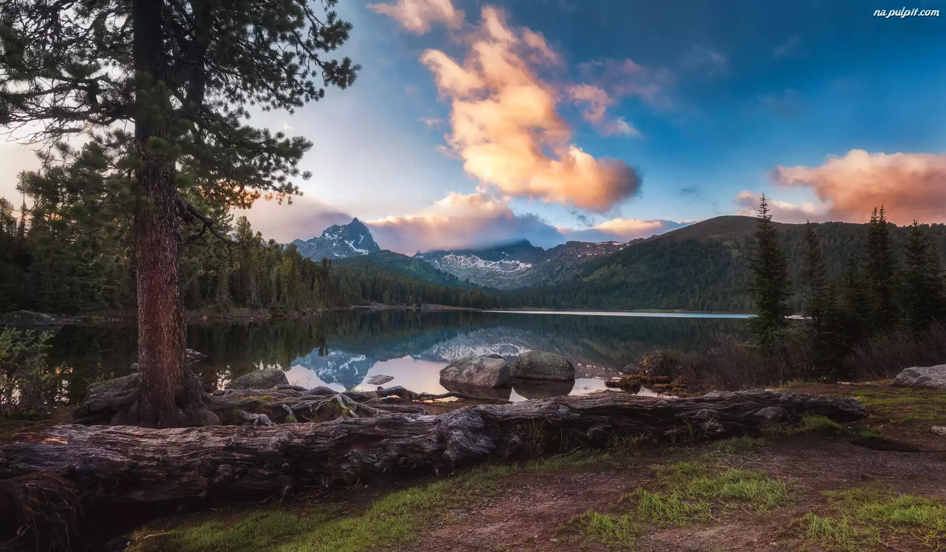 Las, Drzewa, Syberia, Pasmo górskie, Ergaki, Góry, Rosja, Kamienie, Jezioro Na Pulpit