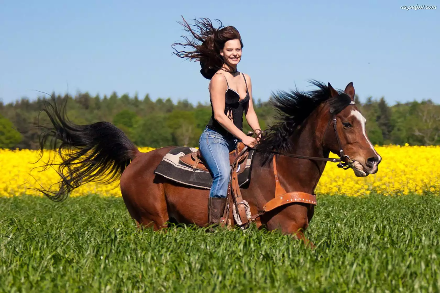 Las, Łąka, Koń, Kobieta, Kwiaty Na Pulpit