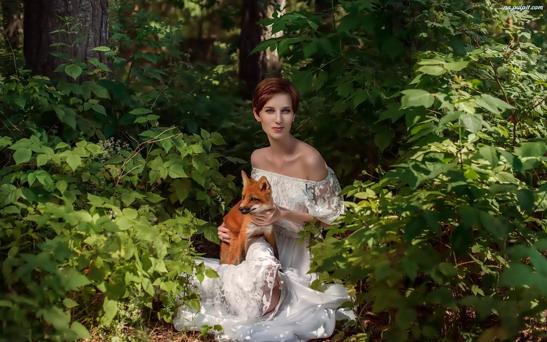 Las, Mały, Lisek, Drzewa, Kobieta, Krzewy