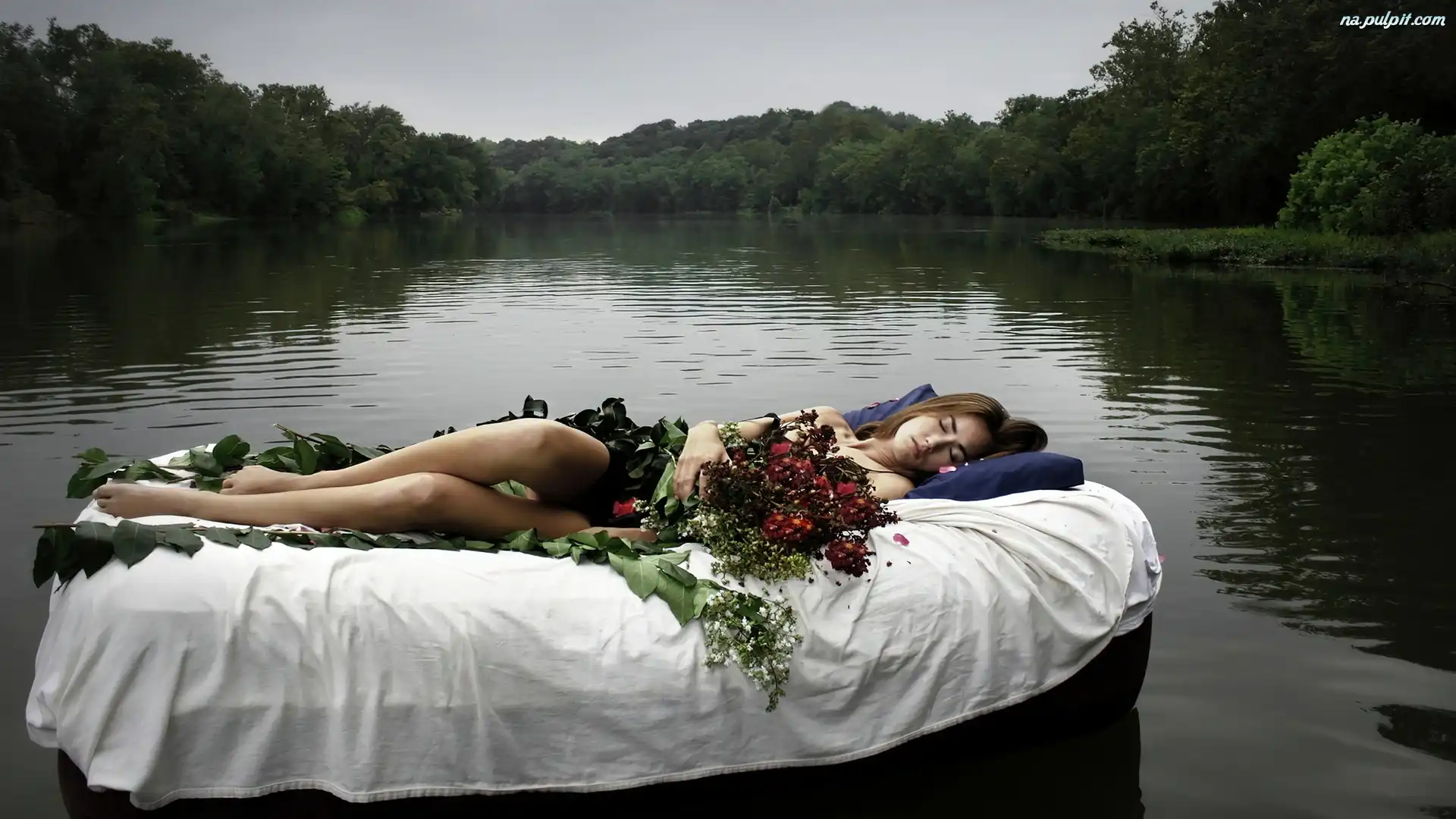 Las, Kwiaty, Sen, Rzeka, Kobieta, Łóżko Na Pulpit