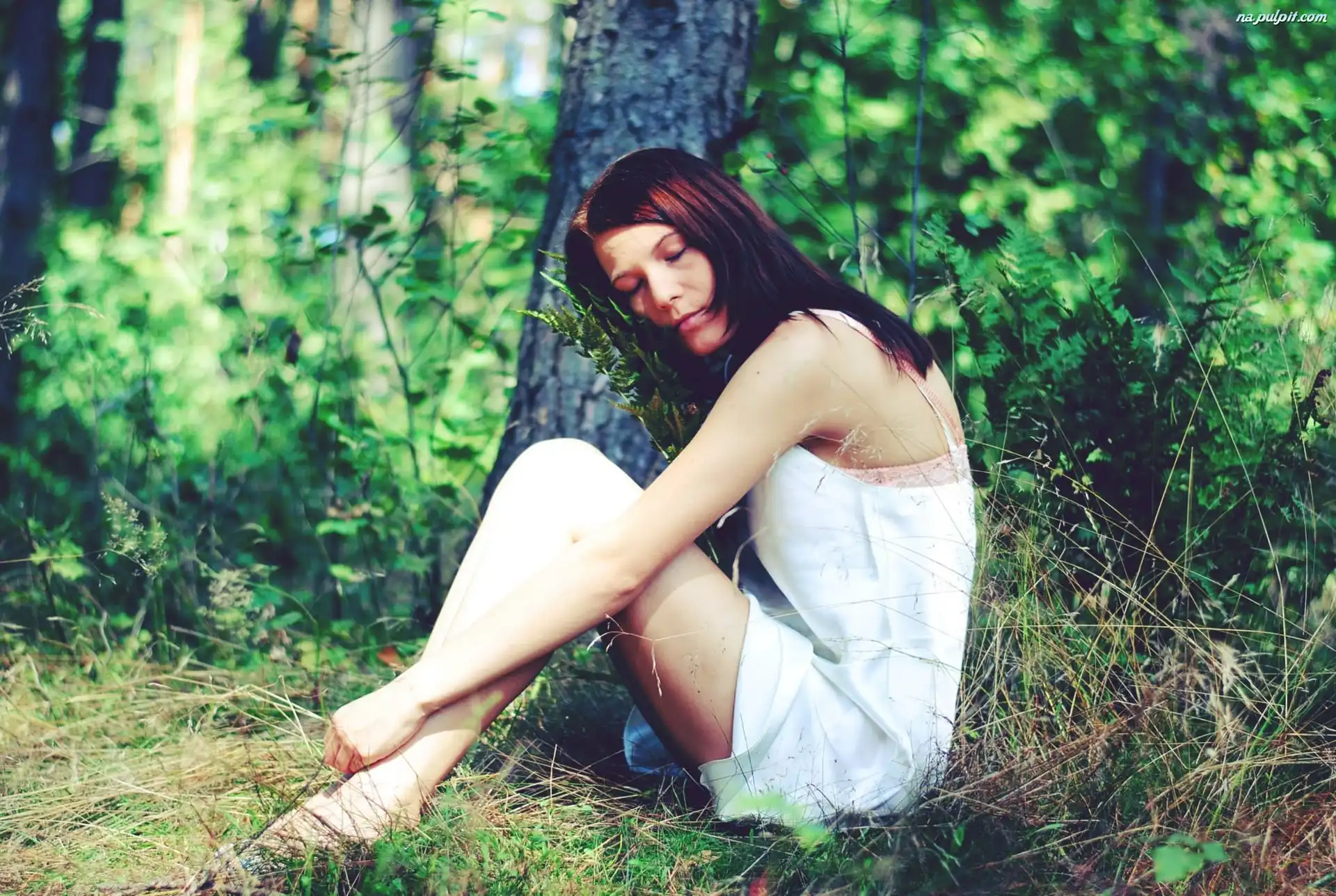 Las, Biała, Szatynka, Kobieta, Sukienka