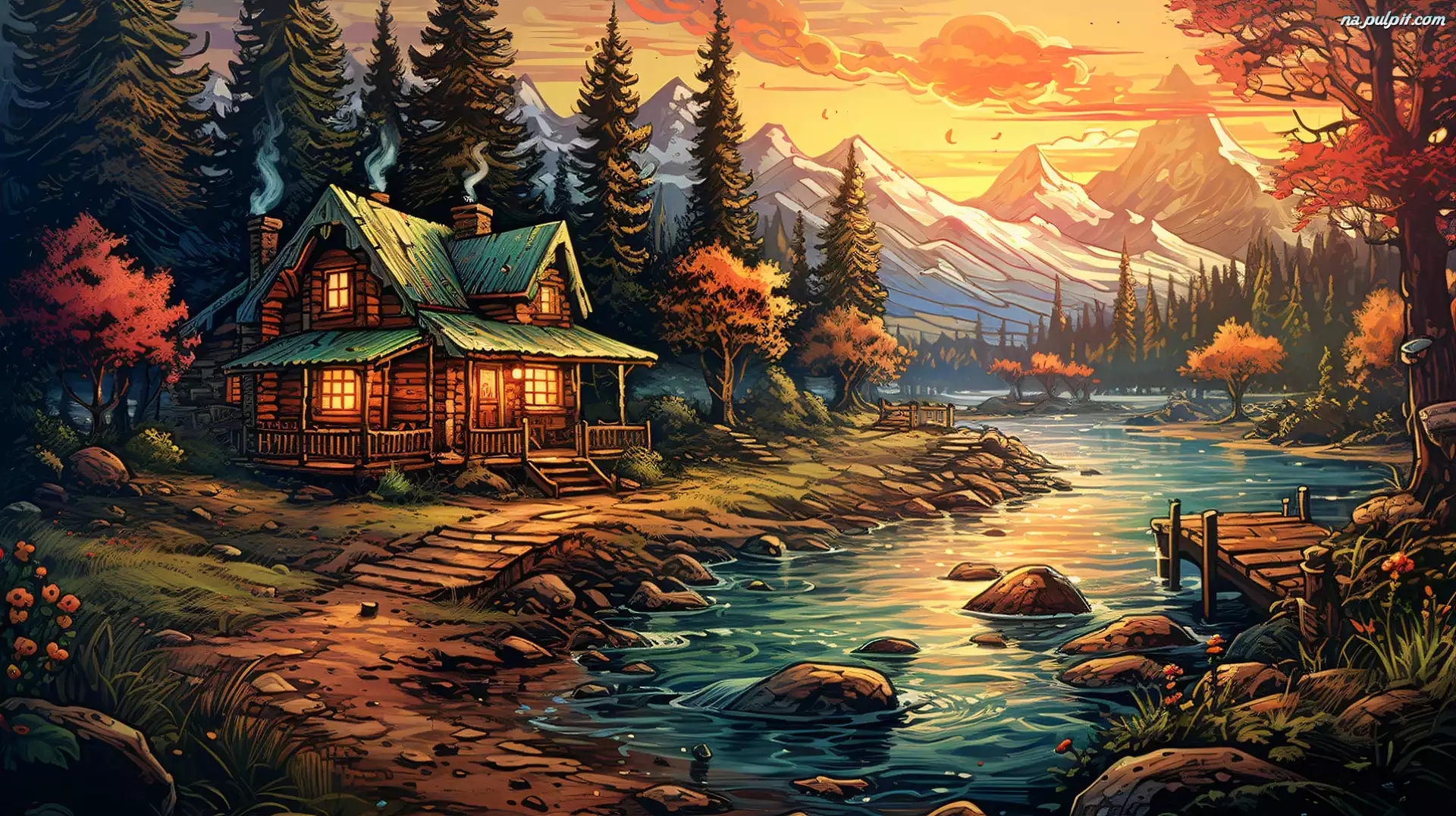 Rzeka, Drzewa, Kwiaty, Dom, Oświetlony, Rośliny, Kamienie, Góry, Pomost, Las, Ścieżka, Grafika Na Pulpit |