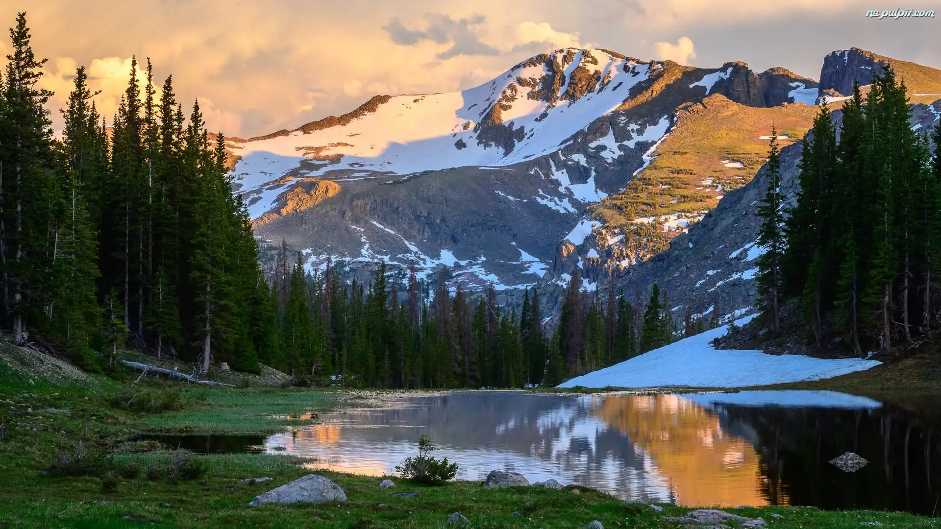 Las, Kolorado, Park Narodowy Gór Skalistych, Drzewa, Chmury, Góry Skaliste, Stany Zjednoczone, Jezioro Na Pulpit |