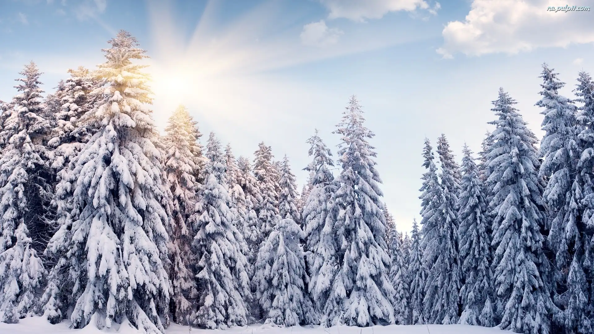 Ośnieżone, Las, Promienie słońca, Drzewa, Zima, Świerki Na Pulpit
