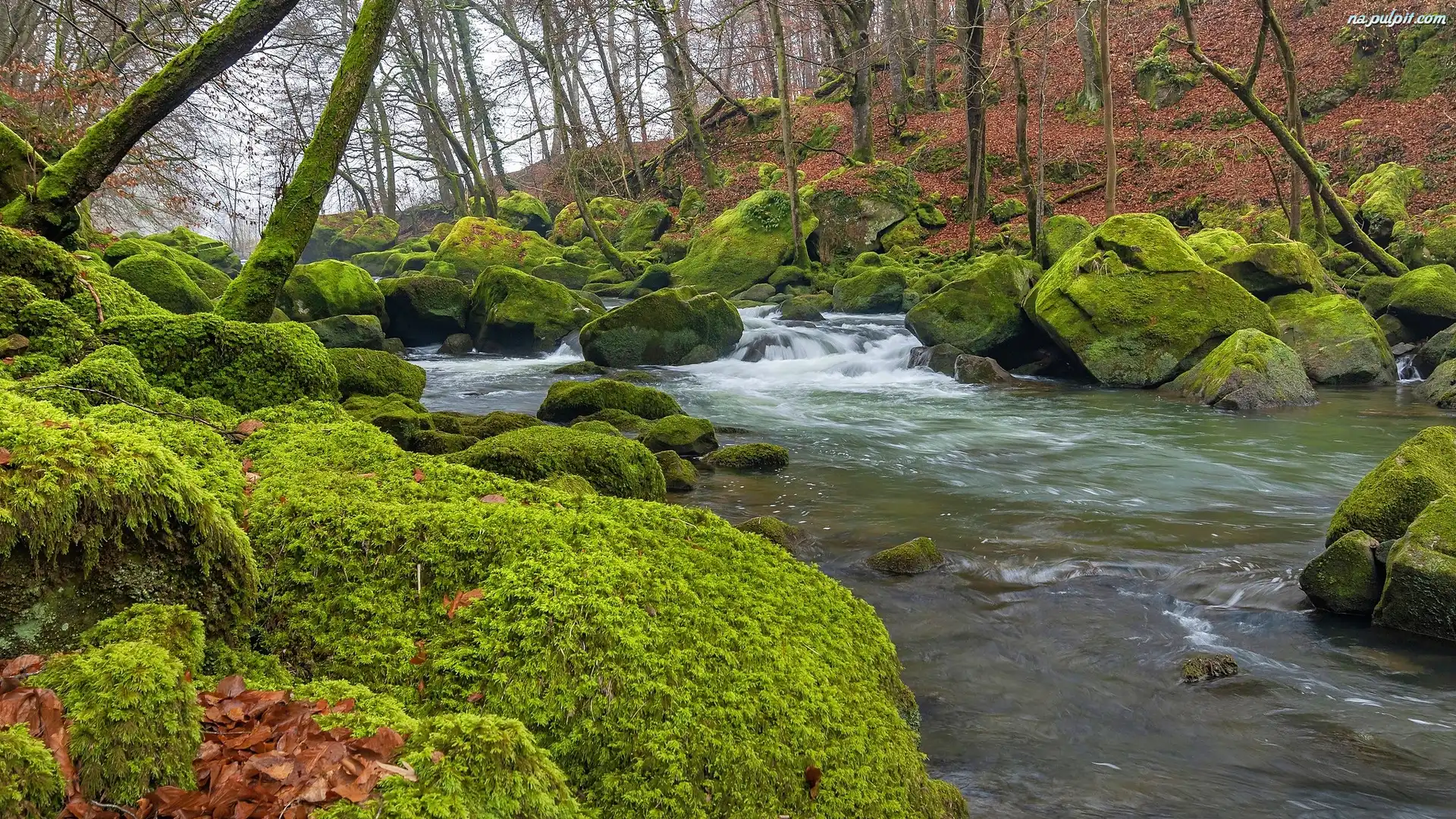 Niemcy, Rzeka Prum, Kamienie, Jesień, Omszone, Skały, Las Na Pulpit