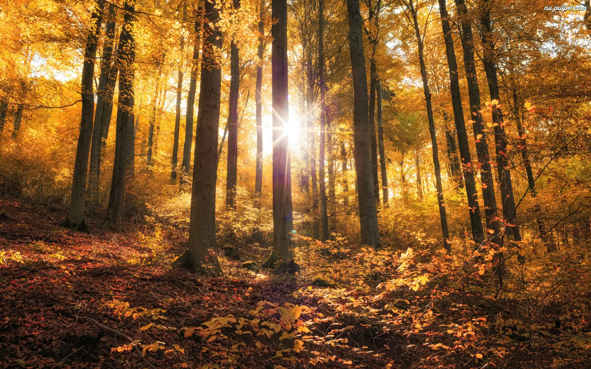 Opadłe, Promienie słońca, Las, Drzewa, Jesień, Liście Na Pulpit