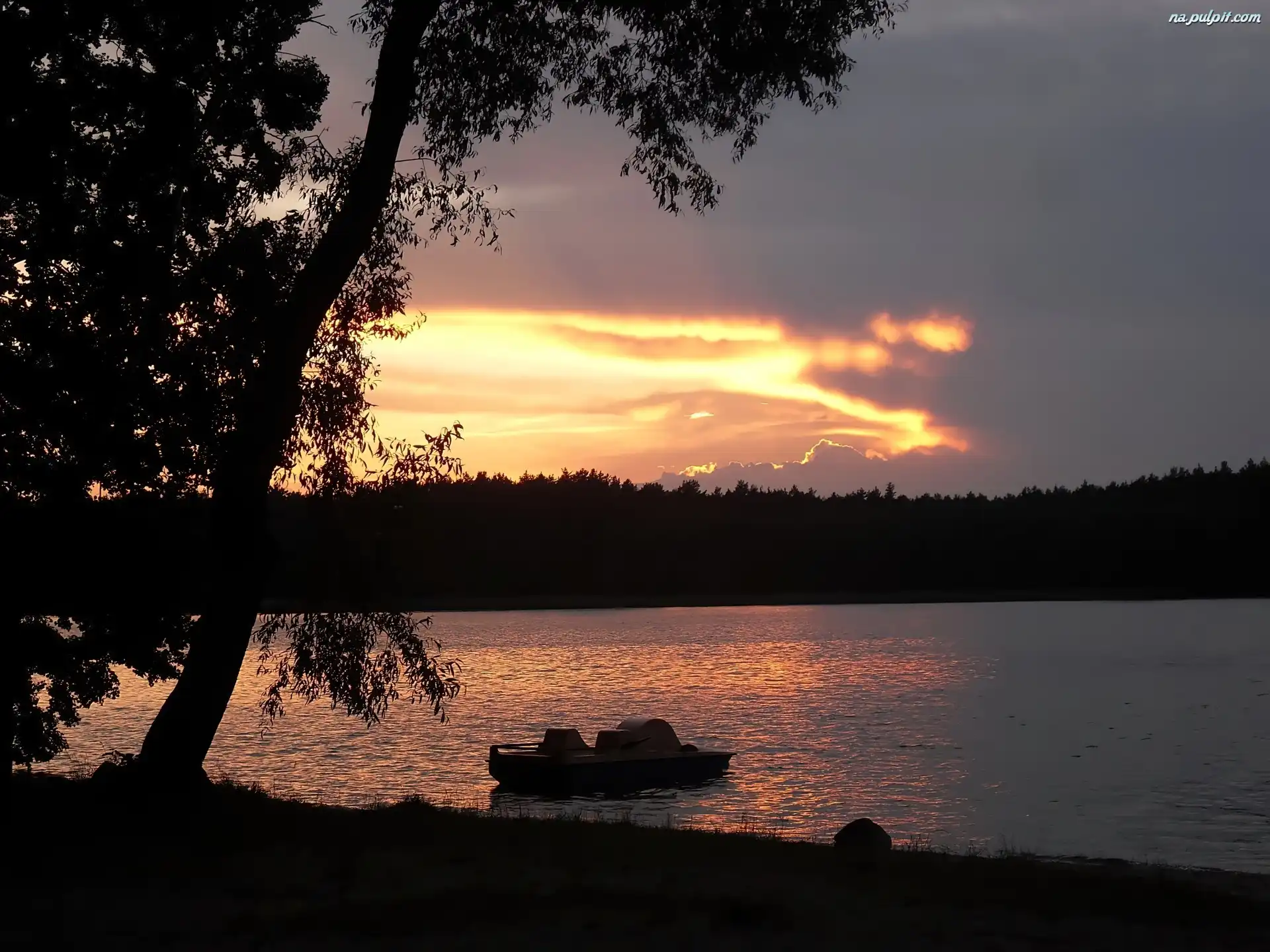 Las, Jezioro, Zachód Słońca, Drzewa Na Pulpit