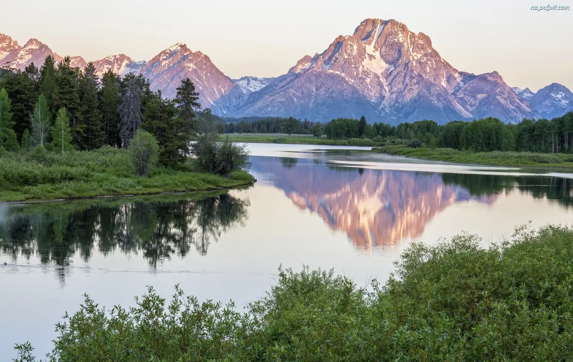 Las, Stan Wyoming, Park Narodowy Grand Teton, Góry, Jezioro Jackson Lake, Odbicie, Szczyt Mount Moran, Stany Zjednoczone, Drzewa Na Pulpit |