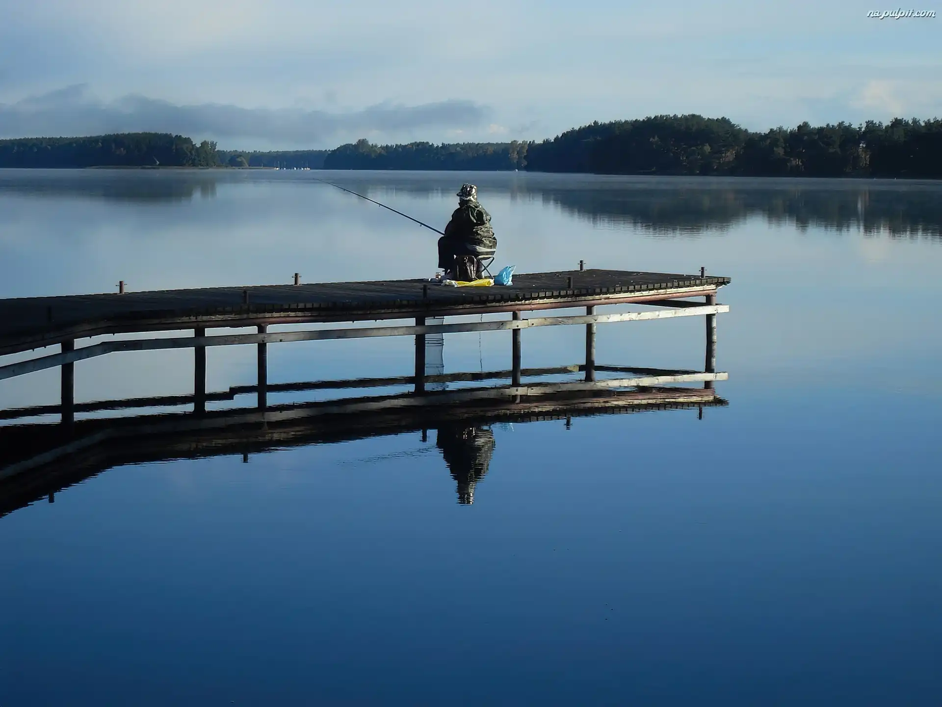 Las, Pomost, Jezioro, Wędkarz, Mgła