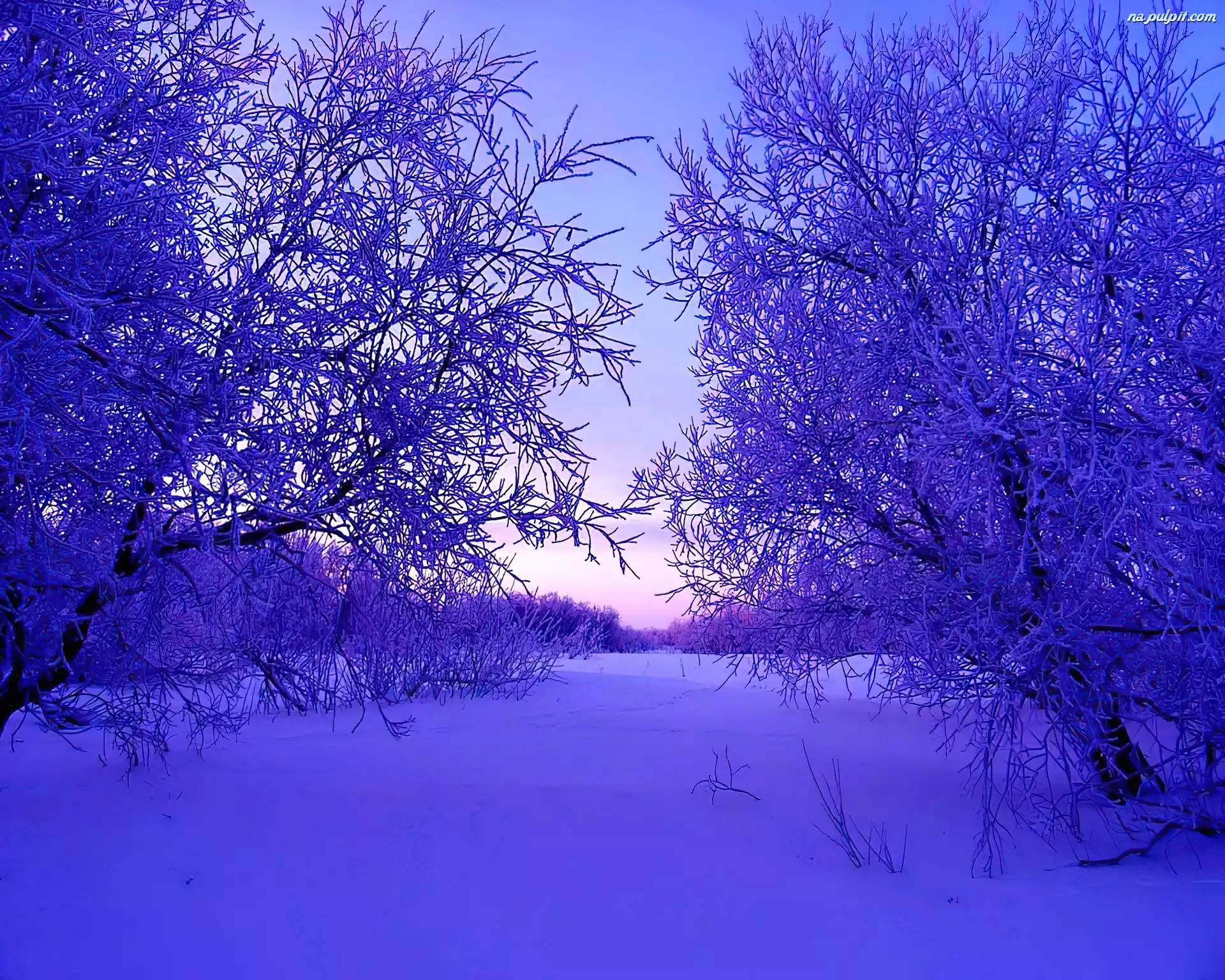 Las, Zima, Śnieg, Wieczór, Drzewa