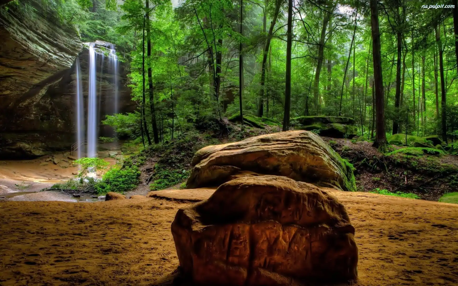 Las, Głazy, Drzewa, Góry, Wodospad, Rzeka