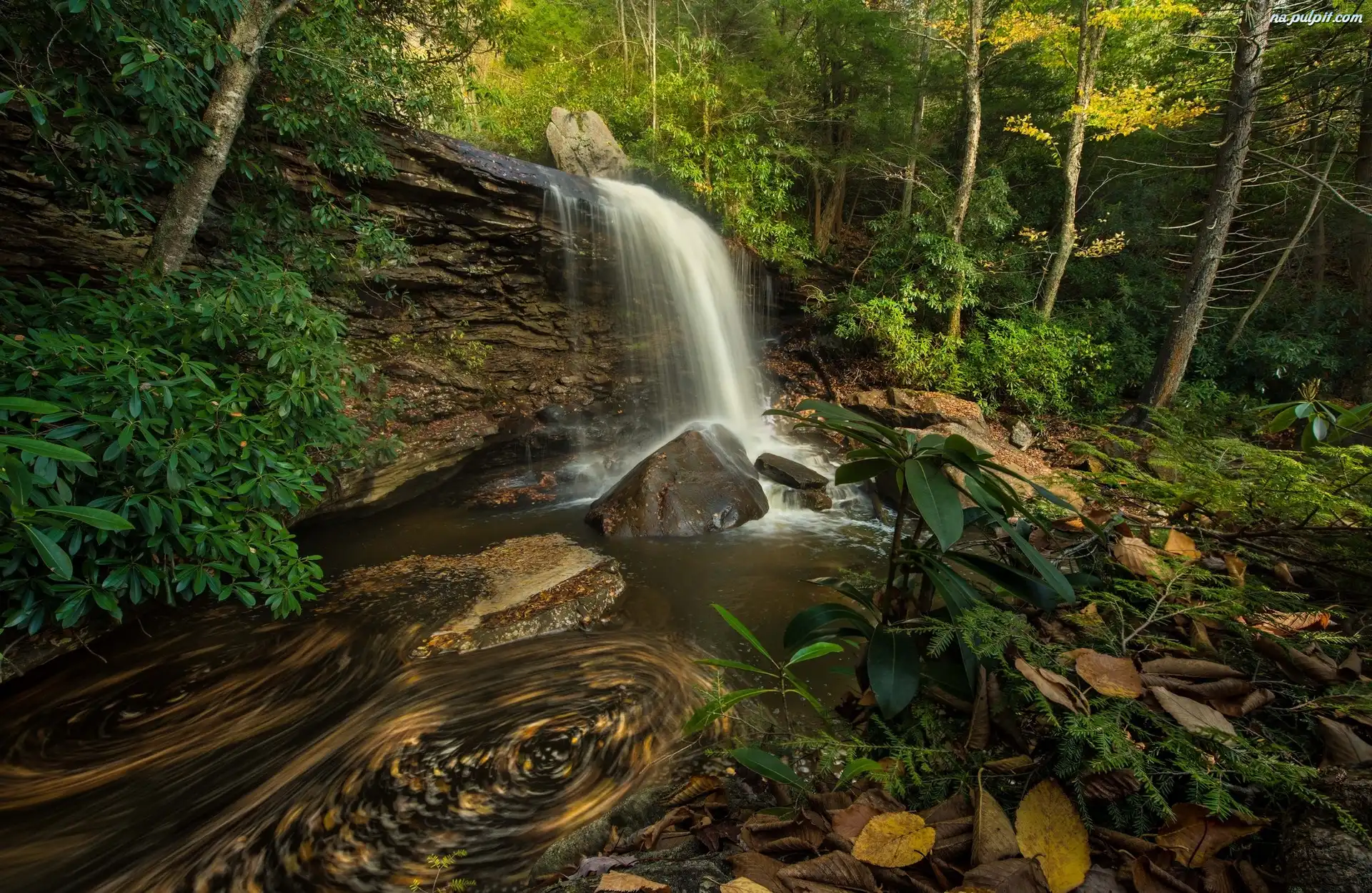 Las, Skały, Liście, Drzewa, Wodospad, Kamienie