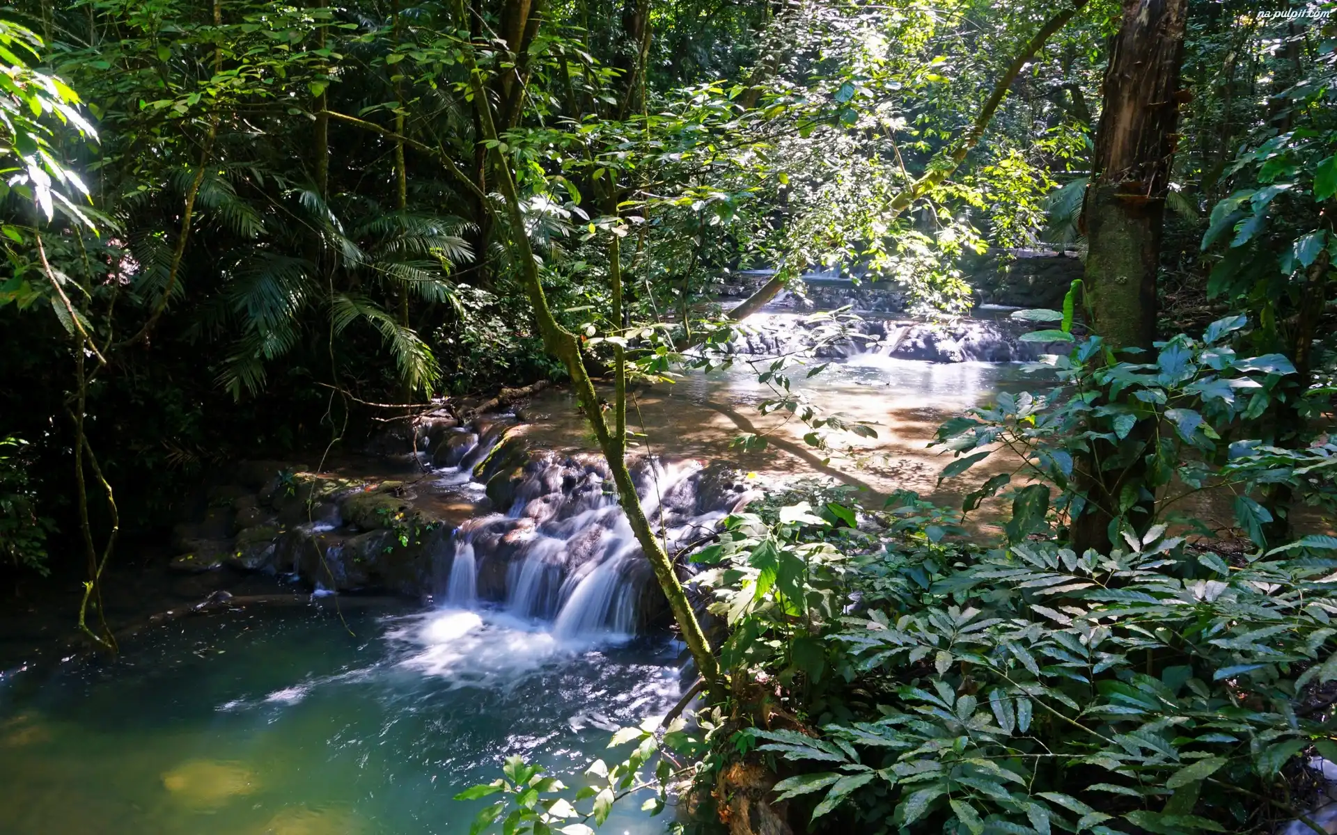 Las, Przebijające, Światło, Palmy, Wodospad, Krzewy Na Pulpit