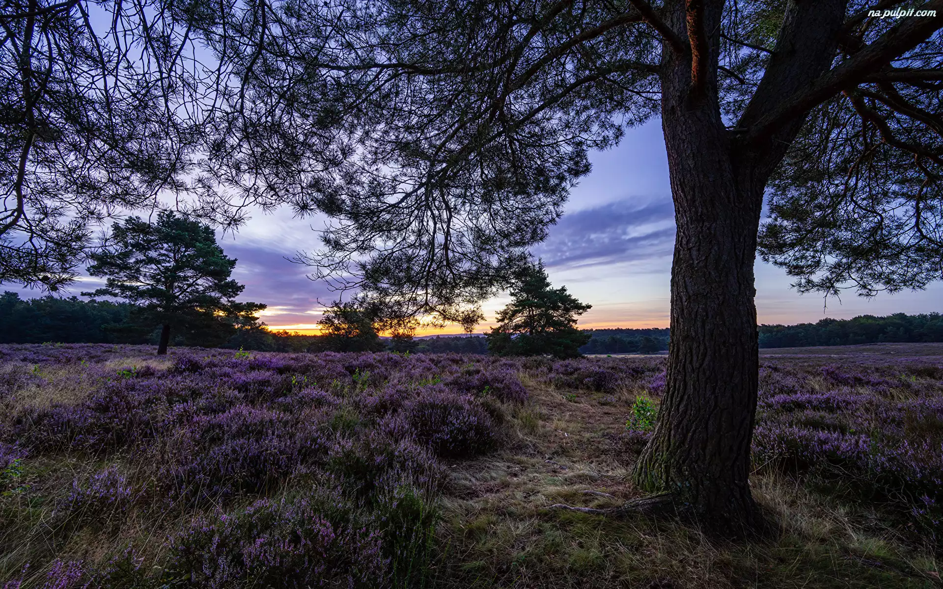 Chmury, Wrzosowisko, Wrzosy, Las, Drzewa, Zachód słońca Na Pulpit