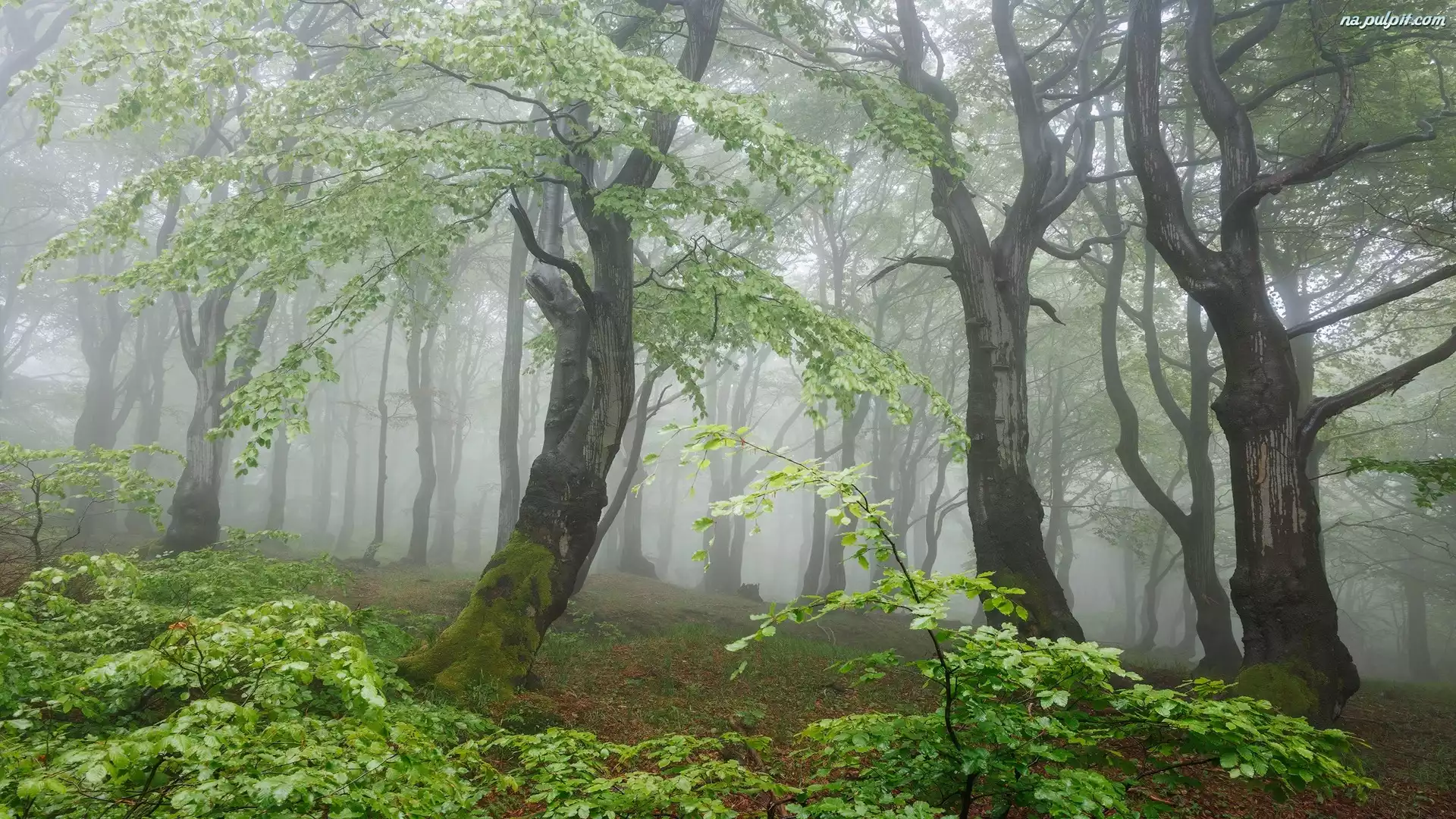 Liściaste, Las, Zielone, Mgła, Drzewa