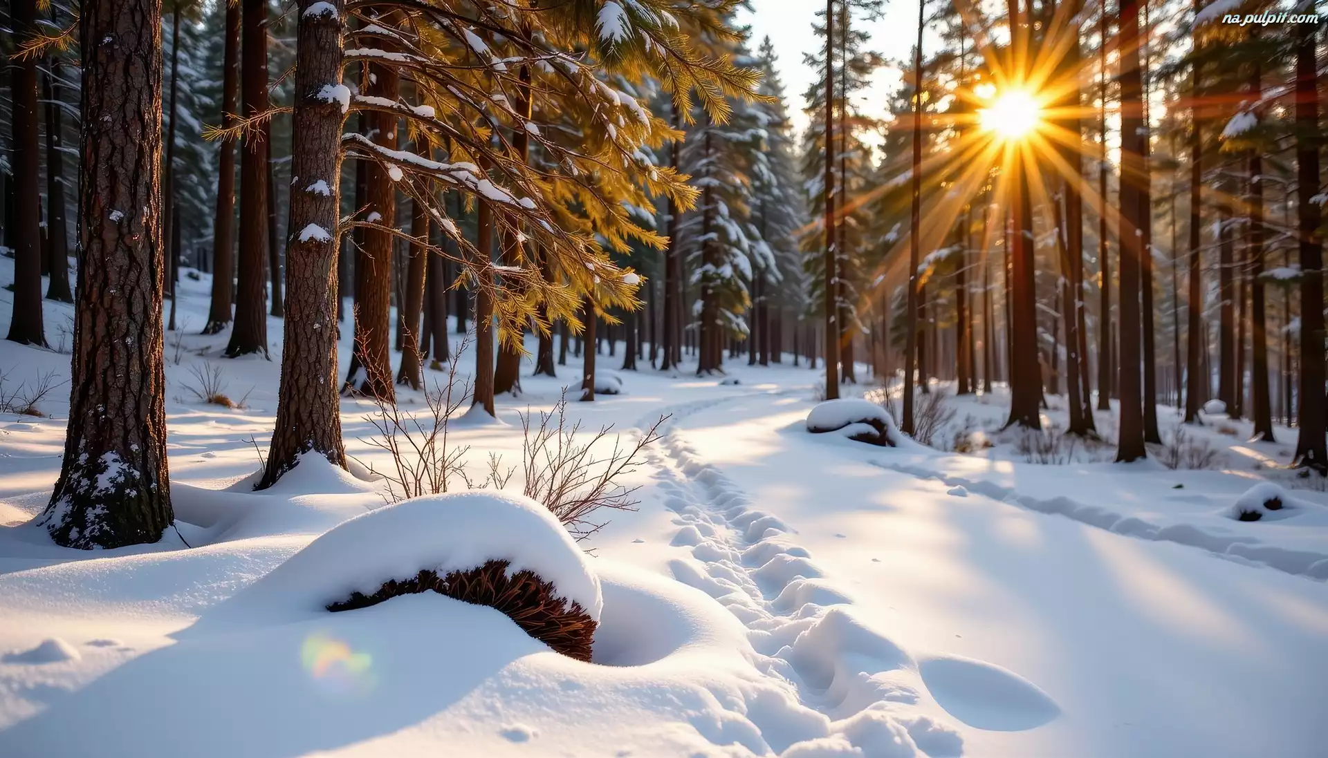 Promienie słońca, Zima, Las, Grafika AI, Drzewa Na Pulpit