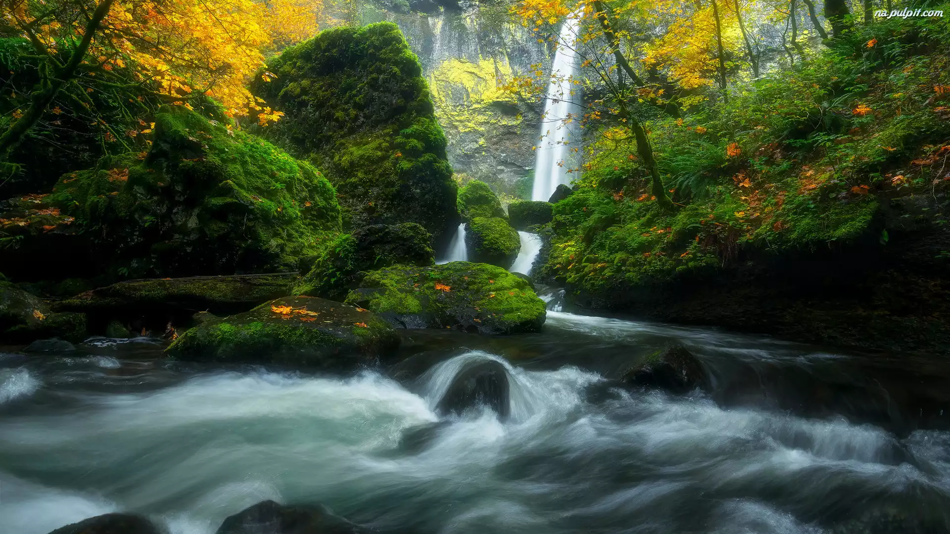 Oregon, Stany Zjednoczone, Wodospad, Rzeka, Columbia River, Elowah Falls, Las, Skały, Omszałe Na Pulpit |