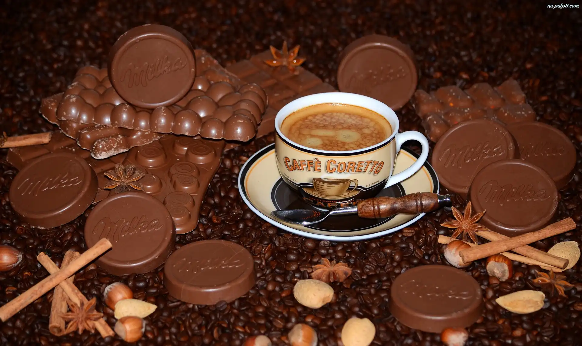 Orzechy laskowe, Ziarna kawy, Łyżeczka, Filiżanka, Czekoladki Na Pulpit