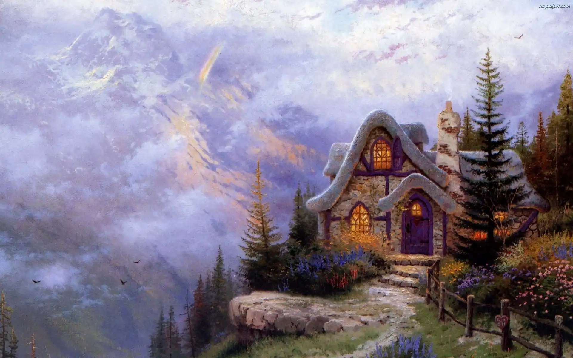 Lasy, Reprodukcja, Obrazu, Góry, Dom, Kwiaty